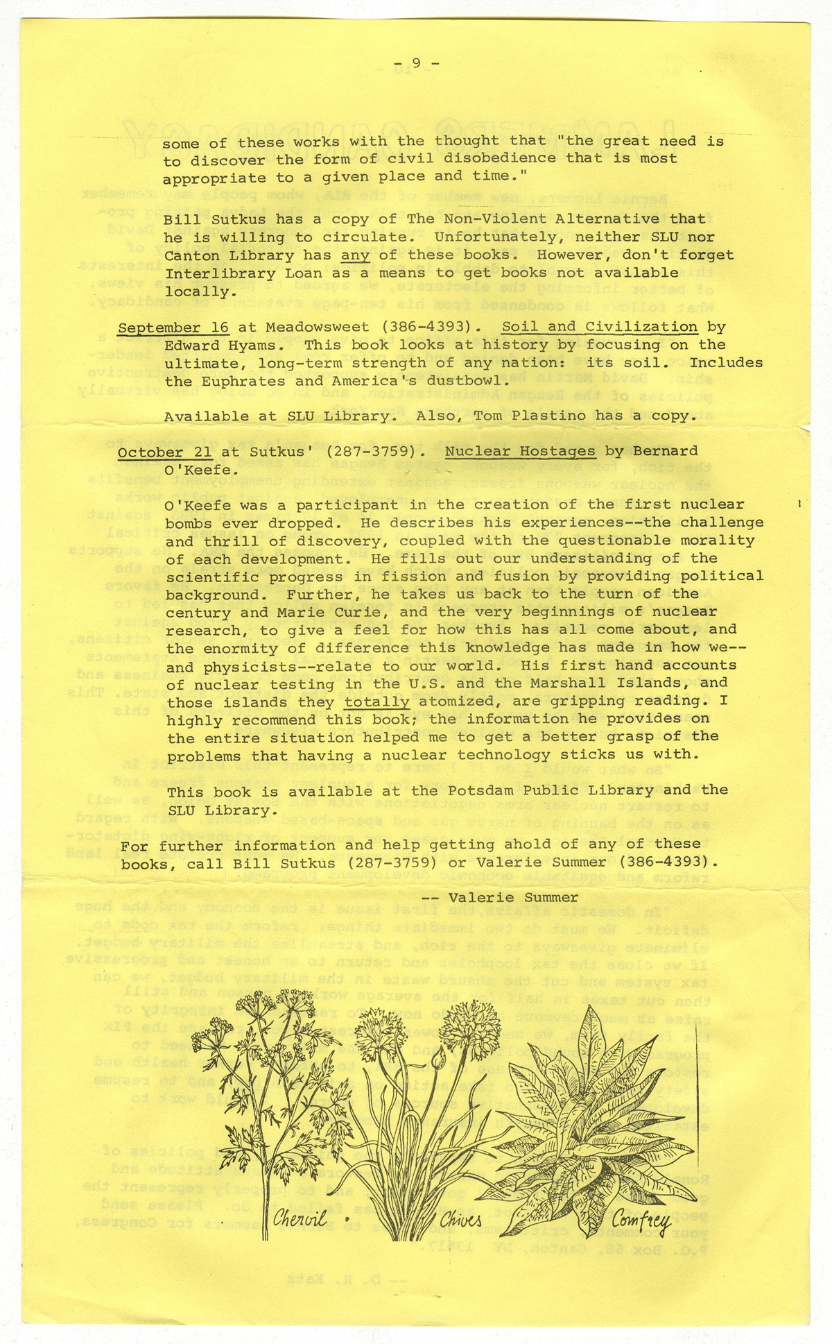 PDF:rla-newsletter-june-1984-8-9.pdf(759.33 KB) Overview Issue:Newsletter of the Rural Life Association; June 1984 Bibliographic Citation:Summer, Valerie. "Reading Group". Newsletter of the Rural Life Association. June (1984): 8-9. Journal Title:Newsletter of the Rural Life Association Creator: Summer, Valerie Subject: Source:Original format: Published in the Newsletter of the Rural Life Association, June 1984. Language:eng Start Page 8 Relation:Back to the Land Rights Rights Management:Original materials may be protected by the Copyright Law of the United States (more information). Technical Digitization Specifications:Scanned at 600ppi on Epson 1000XL scanner as 48-bit RGB uncompressed TIFF images. Images resized to 1200 pixels wide, 150 dpi, and saved as JPEG (level 7) in Photoshop CS4 with Unsharp Mask of 60:1. Date Digital:April 4, 2010 - 21:00 Format:text/html Type:Text