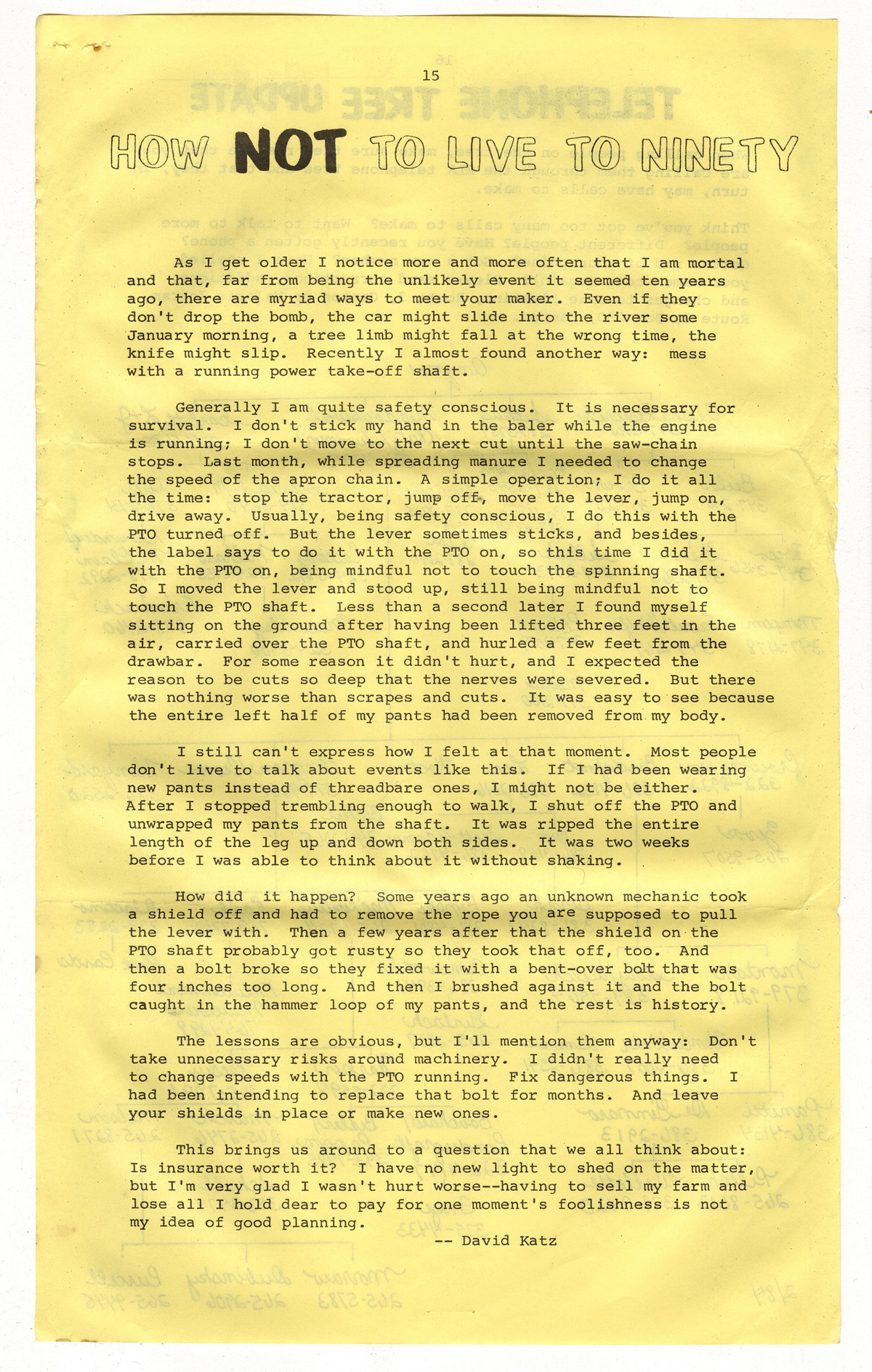 PDF:rla_newsletter_february_1984_15.pdf(462.74 KB) Overview Issue:Newsletter of the Rural Life Association; February 1984 Bibliographic Citation:Katz, David. "How Not to Live to Ninety". Newsletter of the Rural Life Association. February (1984): 15. Journal Title:Newsletter of the Rural Life Association Creator: Katz, David Subject: Source:Original format: Published in the Newsletter of the Rural Life Association, February 1984. Language:eng Start Page 15 Relation:Back to the Land Rights Rights Management:Original materials may be protected by the Copyright Law of the United States (more information). Technical Digitization Specifications:Scanned at 600ppi on Epson 1000XL scanner as 48-bit RGB uncompressed TIFF images. Images resized to 1200 pixels wide, 150 dpi, and saved as JPEG (level 7) in Photoshop CS4 with Unsharp Mask of 60:1. Date Digital:April 4, 2010 - 21:00 Format:text/html Type:Text
