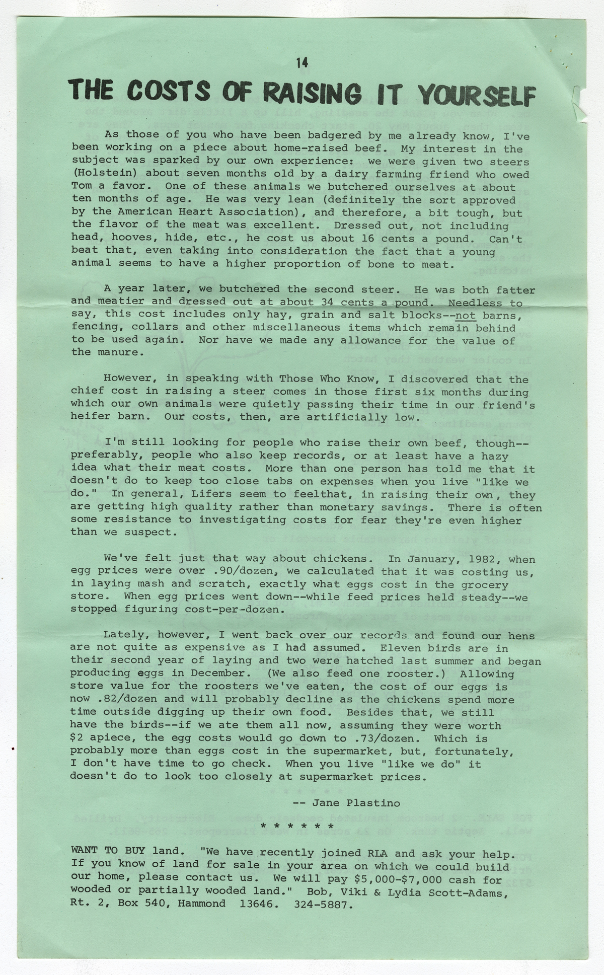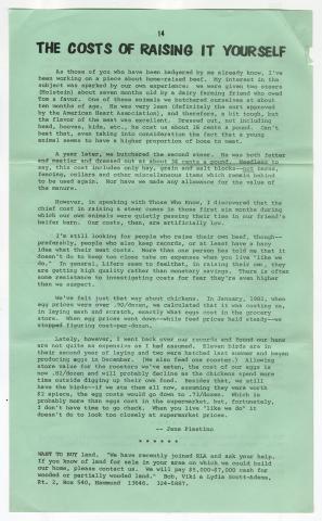 PDF:rla-newsletter-june-1983-14.pdf(1.38 MB) Overview Issue:Newsletter of the Rural Life Association; June 1983 Bibliographic Citation:Plastino, Jane. "The Costs of Raising it Yourself." Newsletter of the Rural Life Association. June (1983): 14. Journal Title:Newsletter of the Rural Life Association Creator: Plastino, Jane Subject: Source:Original format: Published in the Newsletter of the Rural Life Association, June 1983. ODY Special Collections GT3471.N72 R87 1986 Language:eng Start Page 14 Relation:Back to the Land Rights Rights Management:Original materials may be protected by the Copyright Law of the United States (more information). Resource Identifier:ODY Special Collections GT3471.N72 R87 1986 Technical Digitization Specifications:Scanned at 600ppi on Epson 1000XL scanner as 48-bit RGB uncompressed TIFF images. Images resized to 1200 pixels wide, 150 dpi, and saved as JPEG (level 7) in Photoshop CS4 with Unsharp Mask of 60:1. Date Digital:April 12, 2010 - 21:00 Format:text/html Type:Text