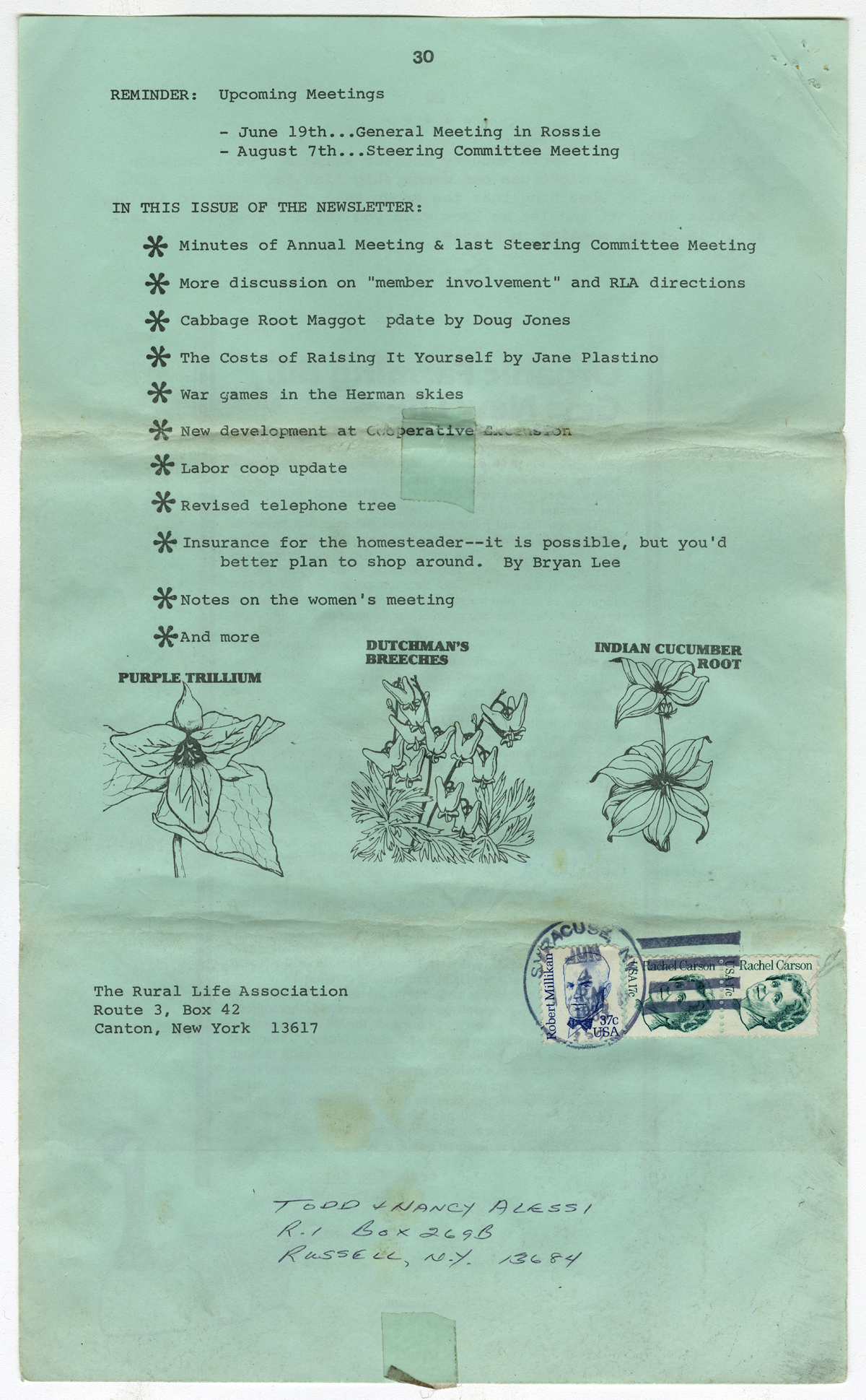 PDF:rla-newsletter-june-1983-30.pdf(1.21 MB) Overview Issue:Newsletter of the Rural Life Association; June 1983 Bibliographic Citation:"Back Cover". Newsletter of the Rural Life Association. June (1983): 30. Journal Title:Newsletter of the Rural Life Association Creator: Subject: Source:Original format: Published in the Newsletter of the Rural Life Association, June 1983. ODY Special Collections GT3471.N72 R87 1986 Language:eng Start Page 30 Relation:Back to the Land Rights Rights Management:Original materials may be protected by the Copyright Law of the United States (more information). Resource Identifier:ODY Special Collections GT3471.N72 R87 1986 Technical Digitization Specifications:Scanned at 600ppi on Epson 1000XL scanner as 48-bit RGB uncompressed TIFF images. Images resized to 1200 pixels wide, 150 dpi, and saved as JPEG (level 7) in Photoshop CS4 with Unsharp Mask of 60:1. Date Digital:April 14, 2010 - 21:00 Format:text/html Type:Text