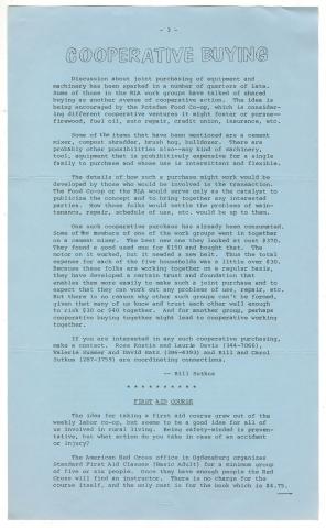 PDF:rla-newsletter-september-3.pdf(425.36 KB) Overview Issue:Newsletter of the Rural Life Association; September 1984 Bibliographic Citation:Sutkus, Bill. "Cooperative Buying". Newsletter of the Rural Life Association. September (1984): 3. Journal Title:Newsletter of the Rural Life Association Creator: Sutkus, Bill Subject: Source:Original format: Published in the Newsletter of the Rural Life Association, September 1984. ODY Special Collections GT3471.N72 R87 1986 Language:eng Start Page 3 Relation:Back to the Land Rights Rights Management:Original materials may be protected by the Copyright Law of the United States (more information). Resource Identifier:ODY Special Collections GT3471.N72 R87 1986 Technical Digitization Specifications:Scanned at 600ppi on Epson 1000XL scanner as 48-bit RGB uncompressed TIFF images. Images resized to 1200 pixels wide, 150 dpi, and saved as JPEG (level 7) in Photoshop CS4 with Unsharp Mask of 60:1. Date Digital:April 25, 2010 - 21:00 Format:text/html Type:Text