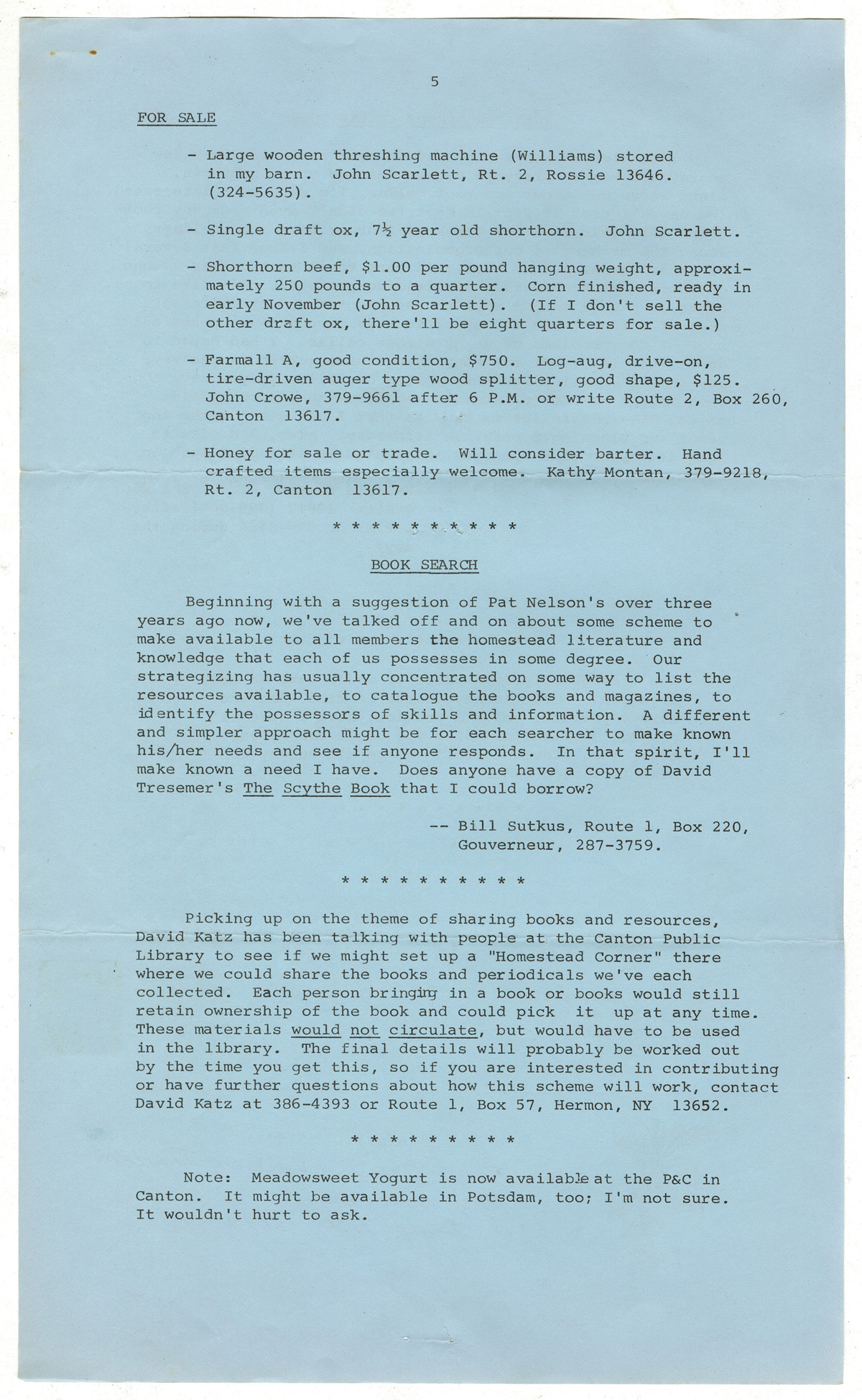 PDF:rla-newsletter-september-5.pdf(349.06 KB) Overview Issue:Newsletter of the Rural Life Association; September 1984 Bibliographic Citation:"Homestead Corner". Newsletter of the Rural Life Association. September (1984): 5. Journal Title:Newsletter of the Rural Life Association Creator: Subject: Source:Original format: Published in the Newsletter of the Rural Life Association, September 1984. ODY Special Collections GT3471.N72 R87 1986 Language:eng Start Page 5 Relation:Back to the Land Rights Rights Management:Original materials may be protected by the Copyright Law of the United States (more information). Resource Identifier:ODY Special Collections GT3471.N72 R87 1986 Technical Digitization Specifications:Scanned at 600ppi on Epson 1000XL scanner as 48-bit RGB uncompressed TIFF images. Images resized to 1200 pixels wide, 150 dpi, and saved as JPEG (level 7) in Photoshop CS4 with Unsharp Mask of 60:1. Date Digital:April 26, 2010 - 21:00 Format:text/html Type:Text
