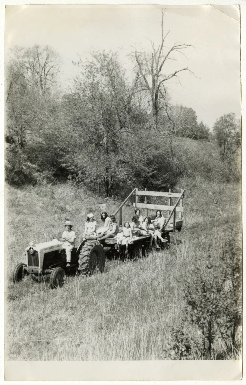 Explore this collection biographical gatherings season extension folklife organic farming group photograph tractors sense of place garlic flowers advertising cover crops green manure fences architecture farming spinach mulch history poetry trees activism harvest energy lettuce building buildings porches tomatoes Overview Creator: Jones, Doug Subject: Organic farmingSustainable agricultureBirdsfoot FarmPicnicFarm tractorsOutdoor recreationFarm lifeCountry living Description:David Katz driving fellow Birdsfooters out for a picnic. Source:Original version: photograph, b&w; 5 x 8 in. Date Original:1980 Rights Rights Management:Original materials may be protected by the Copyright Law of the United States (more information). Resource Identifier:Private Collection Contributor:Birdsfoot Farm Relation:Back to the Land Technical Digitization Specifications:Scanned at 600ppi on Epson 1000XL scanner as 48-bit RGB uncompressed TIFF images. Images resized to 960 pixels wide, 150 dpi, and saved as JPEG (level 7) in Photoshop CS4 with Unsharp Mask of 60:1. Date Digital:Mon, 01/25/2010 - 20:00 Format:image/jpeg Type:Image