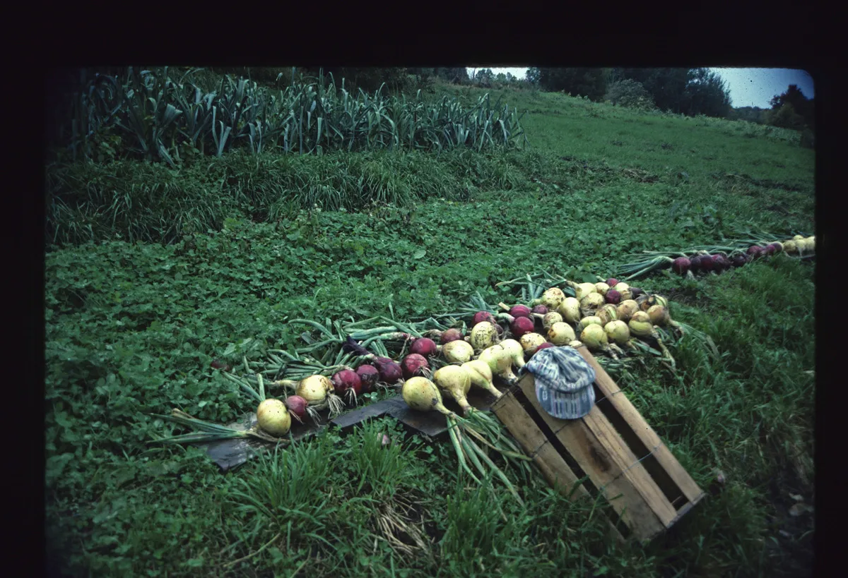 Explore this collection poetry tomatoes gatherings garlic spinach architecture season extension history mulch organic farming porches cover crops harvest lettuce building trees tractors fences advertising sense of place folklife buildings energy flowers farming group photograph activism biographical green manure Overview Creator: Jones, Doug Subject: OnionsVegetablesHarvestingFood dryingOrganic farmingSustainable agricultureBirdsfoot Farm Source:Original version: 35 mm color slide. Date Original:1993 Rights Rights Management:Original materials may be protected by the Copyright Law of the United States (more information). Resource Identifier:Private Collection Contributor:Birdsfoot Farm Relation:Back to the Land Technical Digitization Specifications:Scanned with Nikon Super CoolScan 9000 ED scanner as uncompressed TIFF images. Images resized to 1200 pixels wide, 150 dpi, and saved as JPEG (level 7) in Photoshop CS4 with Unsharp Mask of 60:1. Date Digital:Wed, 01/13/2010 - 20:00 Format:image/jpeg Type:Image