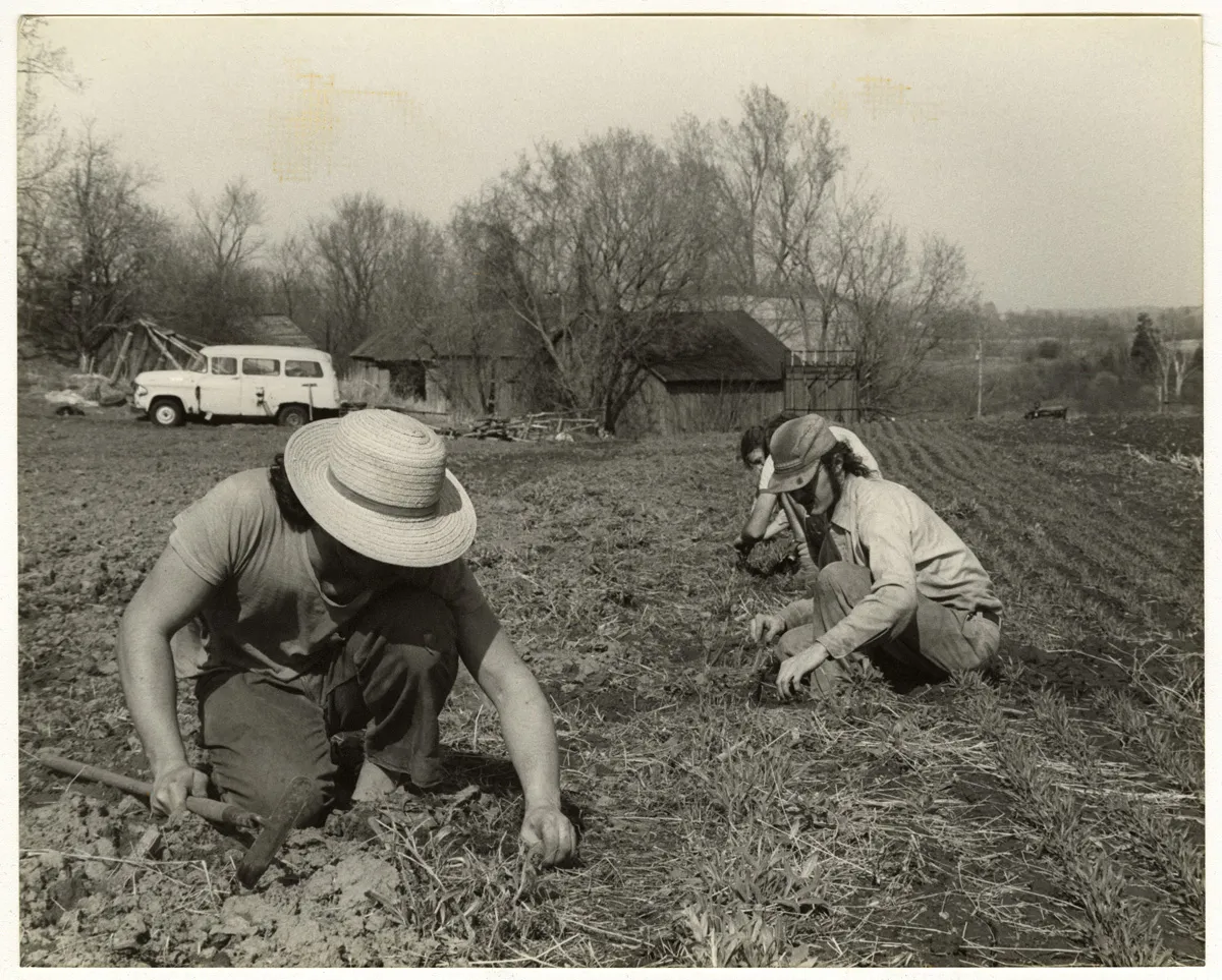 Explore this collection harvest sense of place gatherings energy lettuce garlic architecture mulch green manure trees building history buildings spinach farming flowers biographical season extension folklife tractors organic farming porches activism tomatoes poetry fences advertising group photograph cover crops Overview Creator: Jones, Doug Subject: Organic farmingSustainable agricultureBirdsfoot FarmGardensOrganic gardeningOutbuildingsVegetable gardening Description:David Katz, Doug Jones and unidentified man working in the fields at Birdsfoot. Source:Original version: photograph, b&w; 8x10 in. Rights Rights Management:Original materials may be protected by the Copyright Law of the United States (more information). Resource Identifier:Private Collection Contributor:Katz, David Relation:Back to the Land Technical Digitization Specifications:Scanned at 600ppi on Epson 1000XL scanner as 48-bit RGB uncompressed TIFF images. Images resized to 960 pixels wide, 150 dpi, and saved as JPEG (level 7) in Photoshop CS4 with Unsharp Mask of 60:1. Date Digital:Thu, 11/19/2009 - 20:00 Format:image/jpeg Type:Image