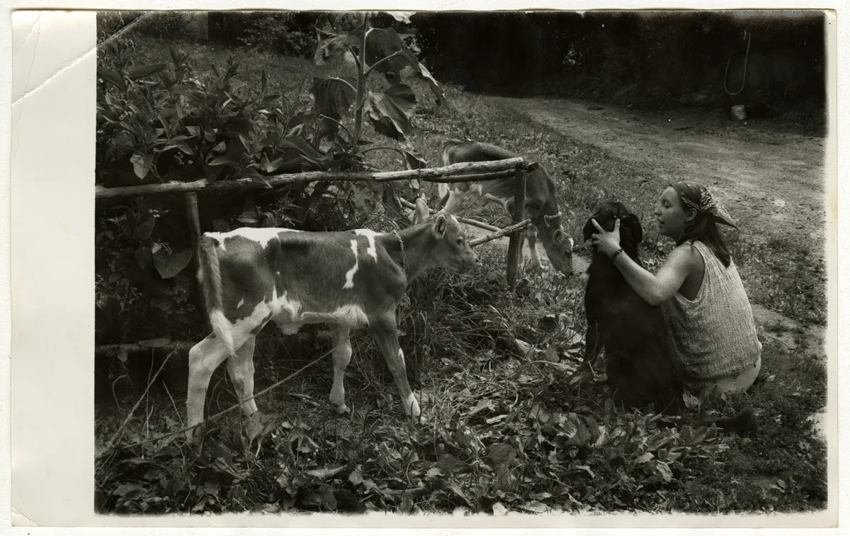 Explore this collection group photograph building lettuce buildings season extension flowers farming harvest energy folklife tomatoes fences organic farming poetry biographical history gatherings cover crops spinach porches green manure advertising architecture sense of place tractors activism mulch trees garlic Overview Creator: Jones, Doug Subject: Birdsfoot FarmAnimal husbandryCattle Description:Valerie Summer petting dog Zucchini pickle, with twin Guernseys Asia and Persia. Source:Original version: photograph, b&w; 5 x 8 in. Date Original:1979 Rights Rights Management:Original materials may be protected by the Copyright Law of the United States (more information). Resource Identifier:Private Collection Contributor:Birdsfoot Farm Relation:Back to the Land Technical Digitization Specifications:Scanned at 600ppi on Epson 1000XL scanner as 48-bit RGB uncompressed TIFF images. Images resized to 960 pixels wide, 150 dpi, and saved as JPEG (level 7) in Photoshop CS4 with Unsharp Mask of 60:1. Date Digital:Mon, 01/25/2010 - 20:00 Format:image/jpeg Type:Image