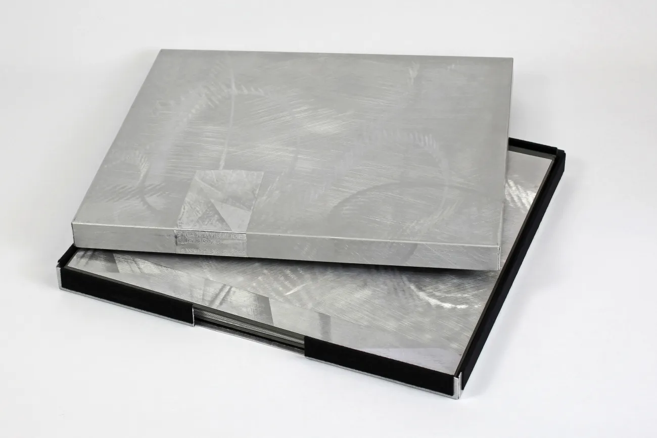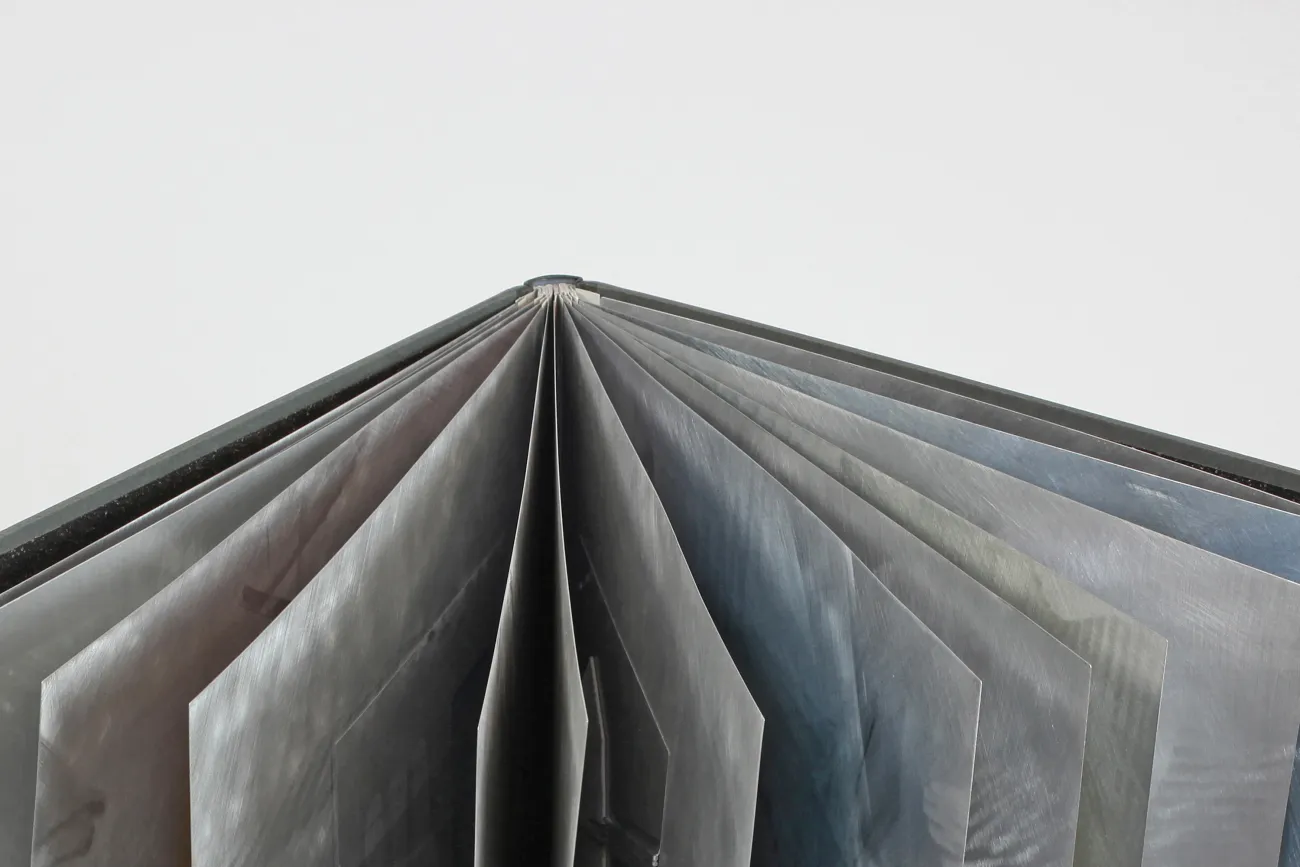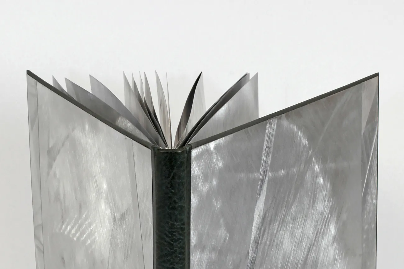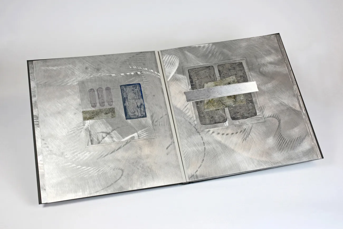 Poem with illustrations and abstract assemblages in acrylic paint on sanded aluminum pages