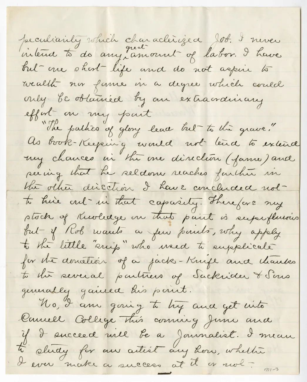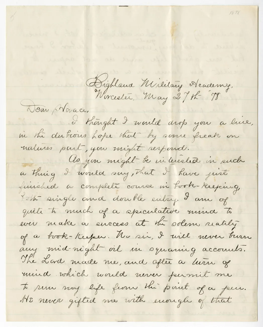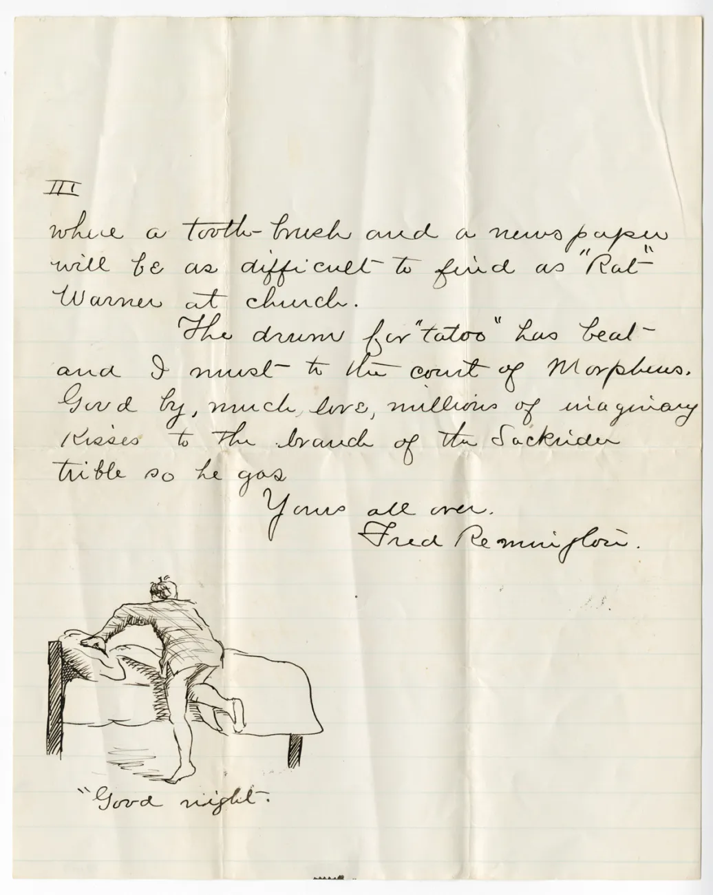 Overview Creator: Remington, Frederic, 1861-1909 Subject: Remington, Frederic, 1861-1909 -- CorrespondenceArtists – United States -- CorrespondenceArt and society -- United States -- History -- 19th centuryRemington, Frederic, 1861-1909 Source:Original letter: ink on paper, 5 p. Date Original:1878-05-27 Language:eng Rights Rights Management:Original materials may be protected by the Copyright Law of the United States (more information). Technical Digitization Specifications:Scanned at 600ppi on Epson 1000XL scanner as 48-bit RGB uncompressed TIFF images. Images resized to 960 pixels wide, 150 dpi, and saved as JPEG (level 7) in Photoshop CS5 with Unsharp Mask of 60:1. Date Digital:Mon, 08/22/2011 - 21:00 Format:image/jpeg Type:Text Location Series:4 Box:4 Folder:M05