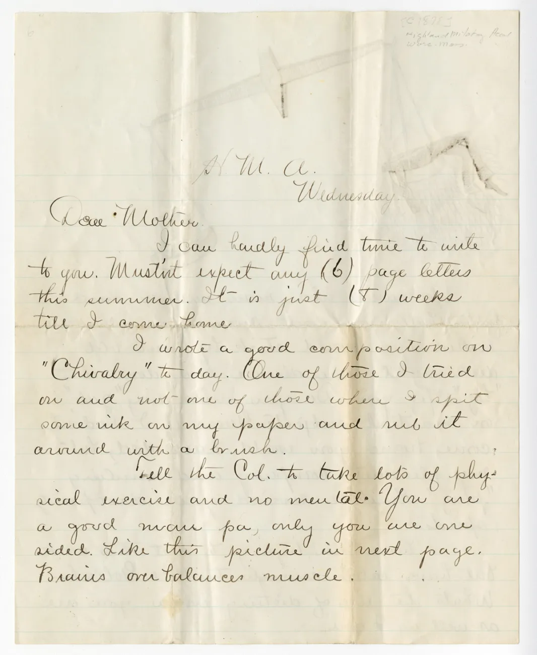Overview Creator: Remington, Frederic, 1861-1909 Subject: Remington, Frederic, 1861-1909 -- CorrespondenceArtists – United States -- CorrespondenceArt and society -- United States -- History -- 19th centuryRemington, Frederic, 1861-1909 Source:Original letter: ink on paper, 4 p. Date Original:ca. 1878 Language:eng Rights Rights Management:Original materials may be protected by the Copyright Law of the United States (more information). Technical Digitization Specifications:Scanned at 600ppi on Epson 1000XL scanner as 48-bit RGB uncompressed TIFF images. Images resized to 960 pixels wide, 150 dpi, and saved as JPEG (level 7) in Photoshop CS5 with Unsharp Mask of 60:1. Date Digital:Sun, 08/21/2011 - 21:00 Format:image/jpeg Type:Text Location Series:4 Box:4 Folder:M06