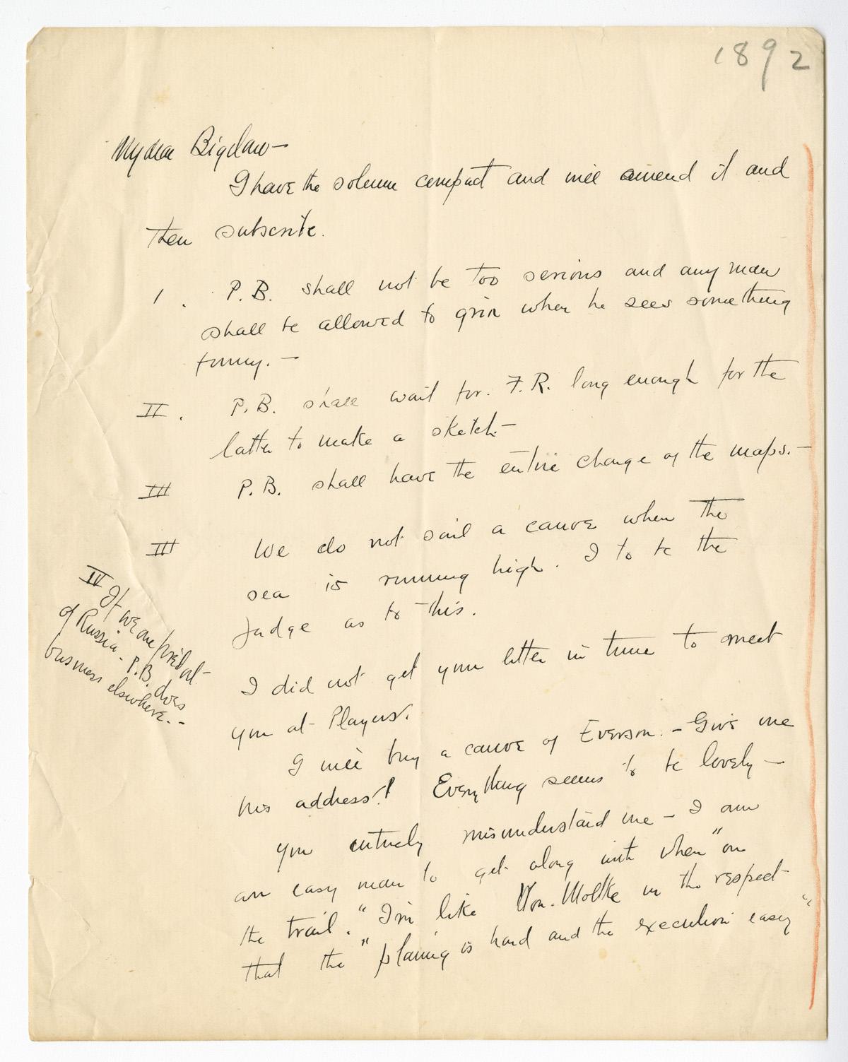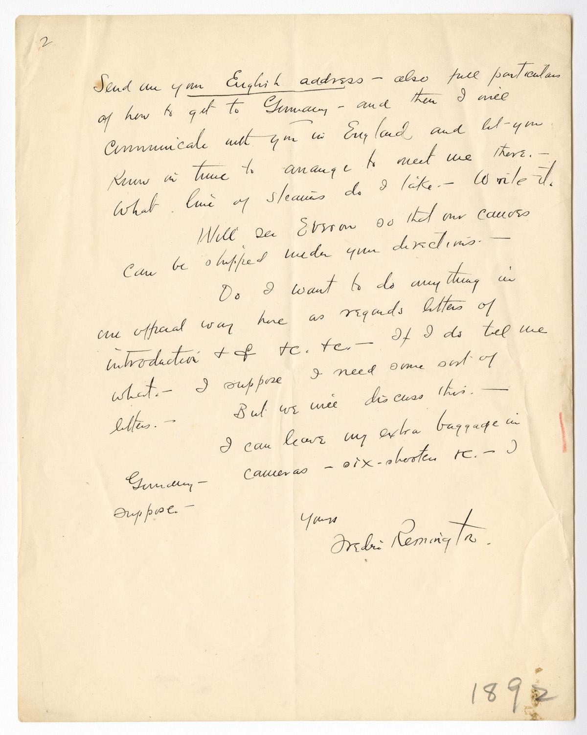 Overview Creator: Remington, Frederic, 1861-1909 Subject: Remington, Frederic, 1861-1909Artists--United States--Correspondence Source:Original letter: ink on paper, 2 p. Language:eng Rights Rights Management:Original materials may be protected by the Copyright Law of the United States (more information). Resource Identifier:Private Collection Technical Digitization Specifications:Scanned at 600ppi on Epson 1000XL scanner as 48-bit RGB uncompressed TIFF images. Images resized to 960 pixels wide, 150 dpi, and saved as JPEG (level 7) in Photoshop CS5 with Unsharp Mask of 60:1. Date Digital:Mon, 09/12/2011 - 21:00 Format:image/jpeg Type:Text Location Series:1 Box:1 Folder:B27