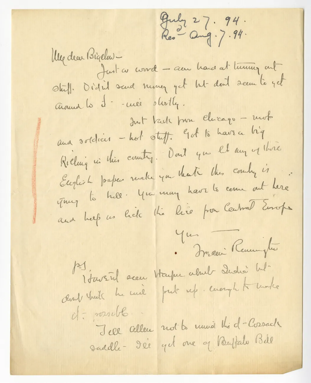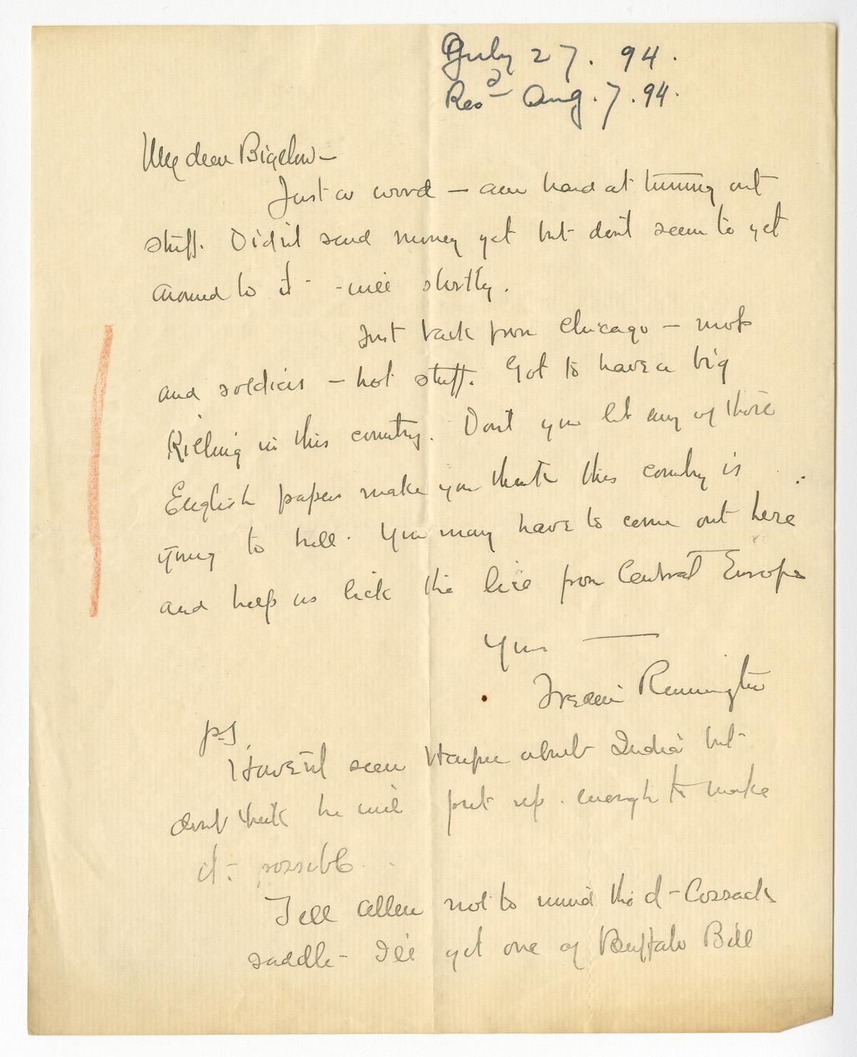 Overview Creator: Remington, Frederic, 1861-1909 Subject: Remington, Frederic, 1861-1909Bigelow, Poultney, 1855-1954 Source:Original letter: ink on paper, 1 p. Language:eng Rights Rights Management:Original materials may be protected by the Copyright Law of the United States (more information). Resource Identifier:Private Collection Technical Digitization Specifications:Scanned at 600ppi on Epson 1000XL scanner as 48-bit RGB uncompressed TIFF images. Images resized to 960 pixels wide, 150 dpi, and saved as JPEG (level 7) in Photoshop CS5 with Unsharp Mask of 60:1. Date Digital:Thu, 09/15/2011 - 21:00 Format:image/jpeg Type:Text Location Series:1 Box:1 Folder:B56