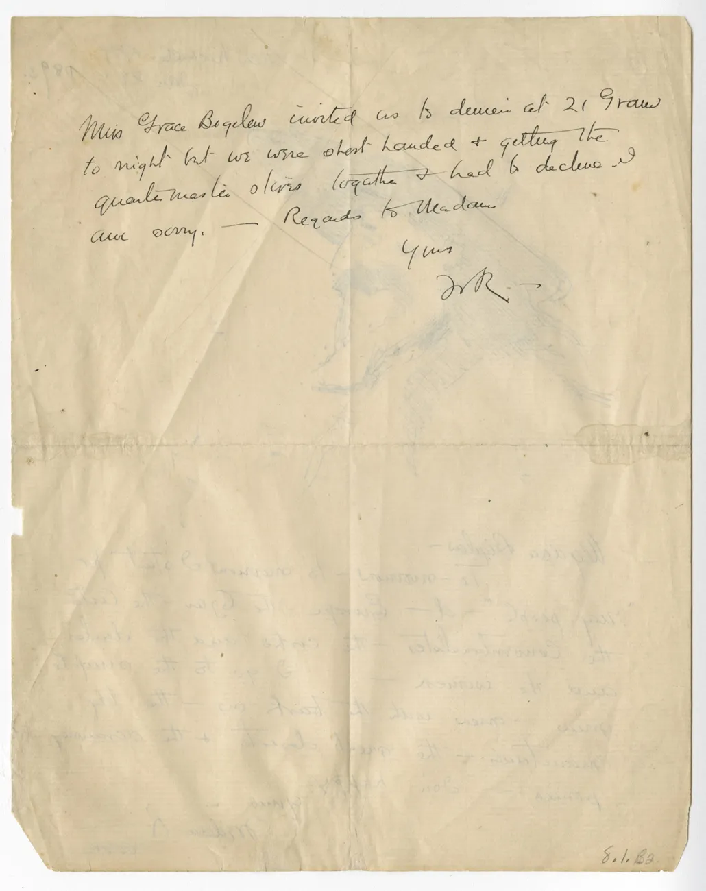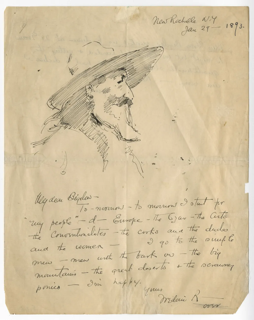 Overview Creator: Remington, Frederic, 1861-1909 Subject: Remington, Frederic, 1861-1909 -- CorrespondenceArtists – United States -- CorrespondenceArt and society -- United States -- History -- 19th centuryRemington, Frederic, 1861-1909Bigelow, Poultney, b. 1855 Source:Original letter: ink on paper, 2 p. Date Original:1893-01-29 Language:eng Rights Rights Management:Original materials may be protected by the Copyright Law of the United States (more information). Technical Digitization Specifications:Scanned at 600ppi on Epson 1000XL scanner as 48-bit RGB uncompressed TIFF images. Images resized to 960 pixels wide, 150 dpi, and saved as JPEG (level 7) in Photoshop CS5 with Unsharp Mask of 60:1. Date Digital:Wed, 08/10/2011 - 21:00 Format:image/jpeg Type:Text Location Series:1 Box:1 Folder:B30