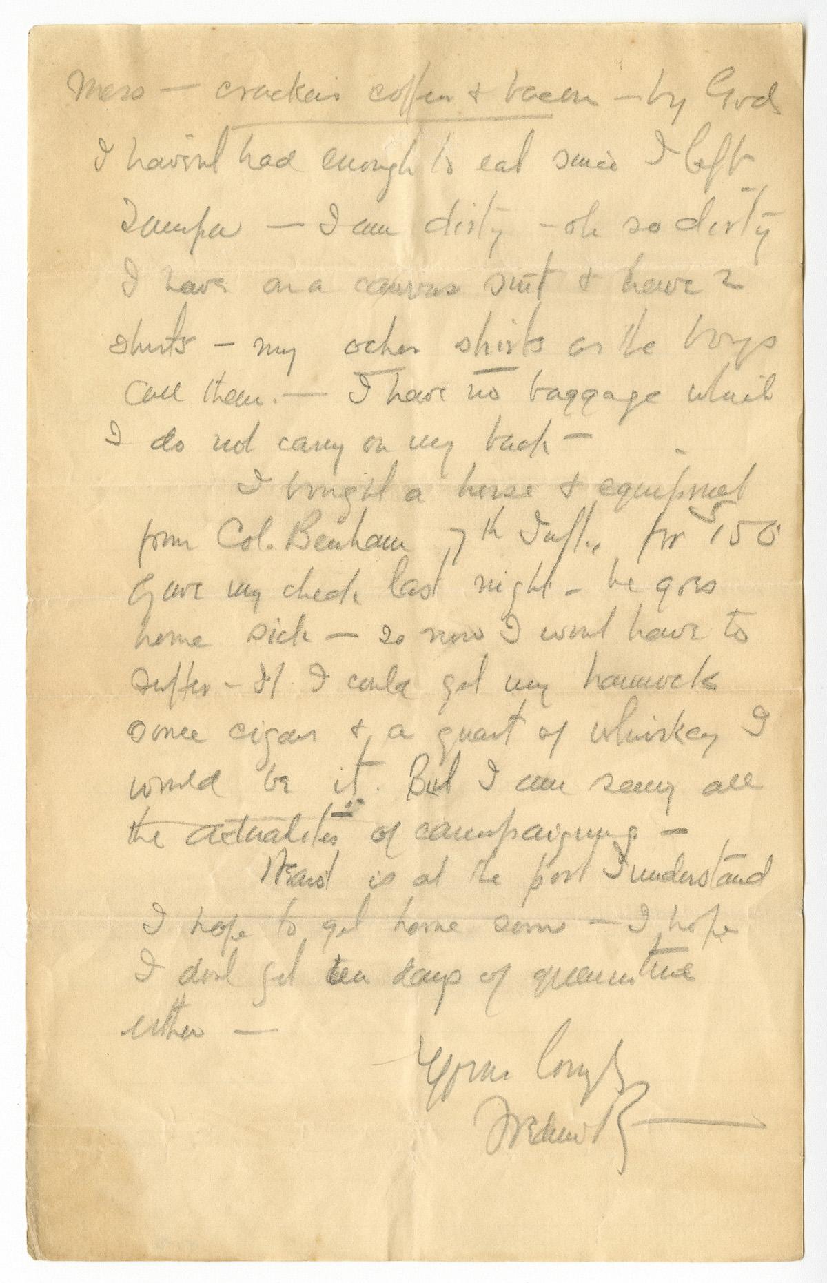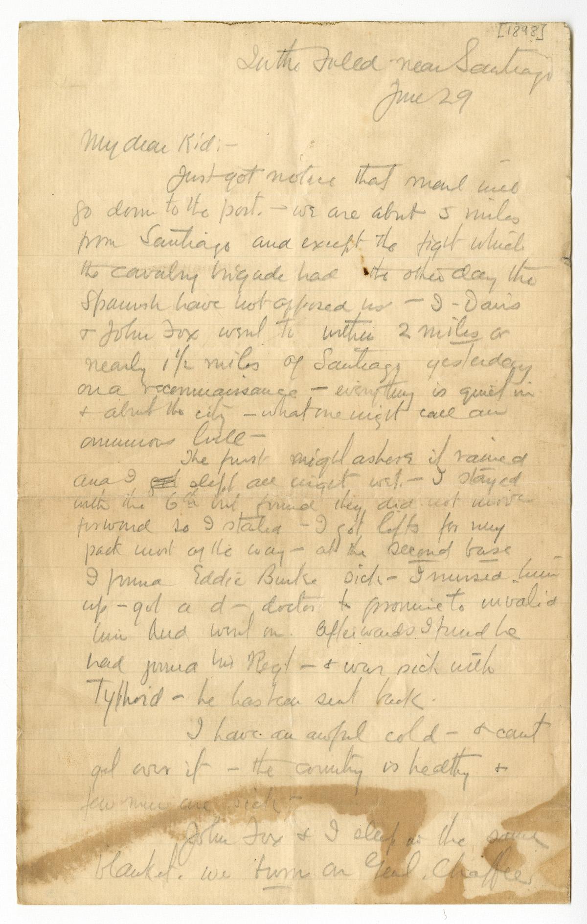 we are about 5 miles from Santiago and except the fight which the cavalry brigade had the other day the Spanish have not opposed us - I, Davis + John Fox went to within 2 miles or nearly 1½ miles of Santiago yesterday on a reconnaissance - everything is quiet in + about the city - what one might call an ominous lull
