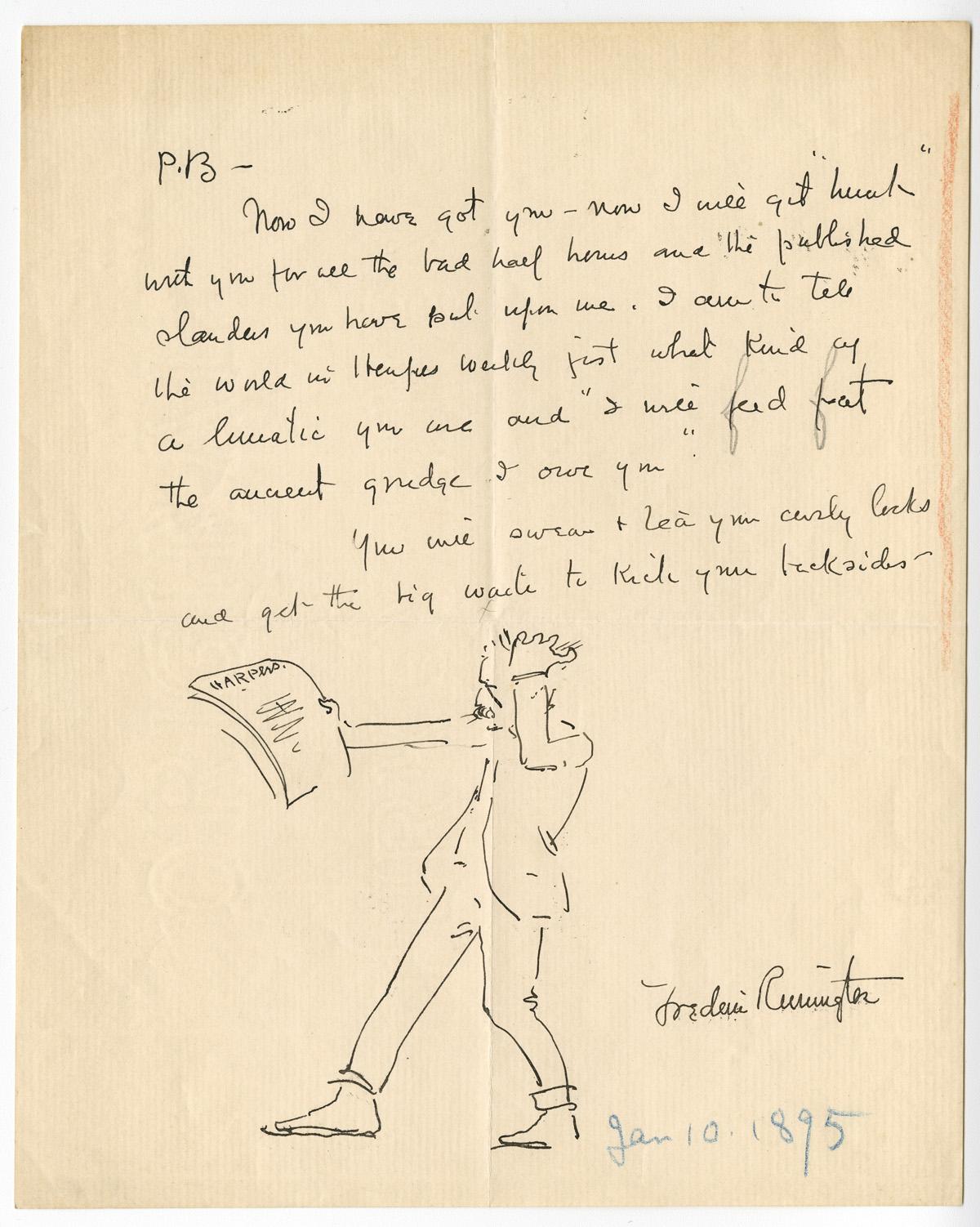 Overview Creator: Remington, Frederic, 1861-1909 Subject: Remington, Frederic, 1861-1909 -- CorrespondenceArtists – United States -- CorrespondenceArt and society -- United States -- History -- 19th centuryRemington, Frederic, 1861-1909Bigelow, Poultney, b. 1855 Source:Original letter: ink on paper, 1 p. Date Original:1865-01-10 Language:eng Rights Rights Management:Original materials may be protected by the Copyright Law of the United States (more information). Technical Digitization Specifications:Scanned at 600ppi on Epson 1000XL scanner as 48-bit RGB uncompressed TIFF images. Images resized to 960 pixels wide, 150 dpi, and saved as JPEG (level 7) in Photoshop CS5 with Unsharp Mask of 60:1. Date Digital:Wed, 08/17/2011 - 21:00 Format:image/jpeg Type:Text Location Series:1 Box:1 Folder:B65