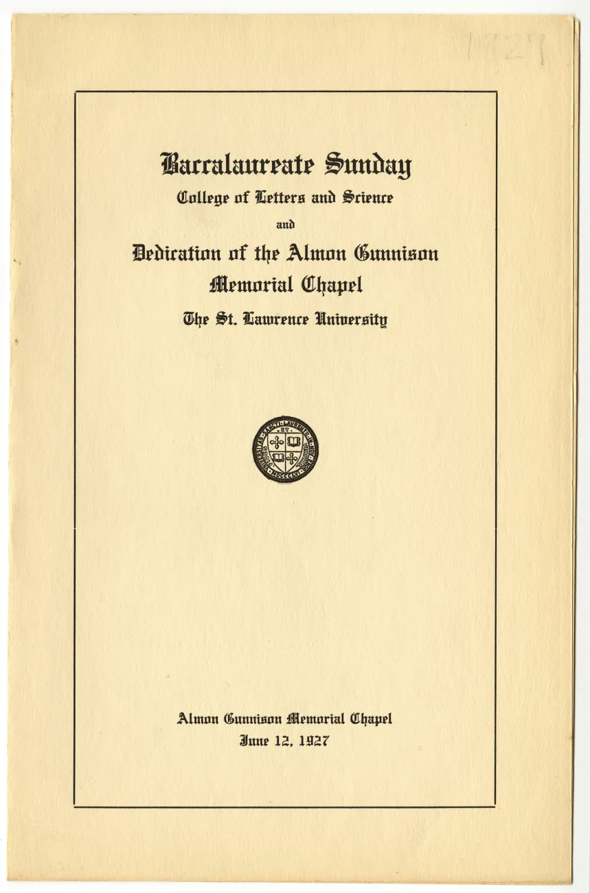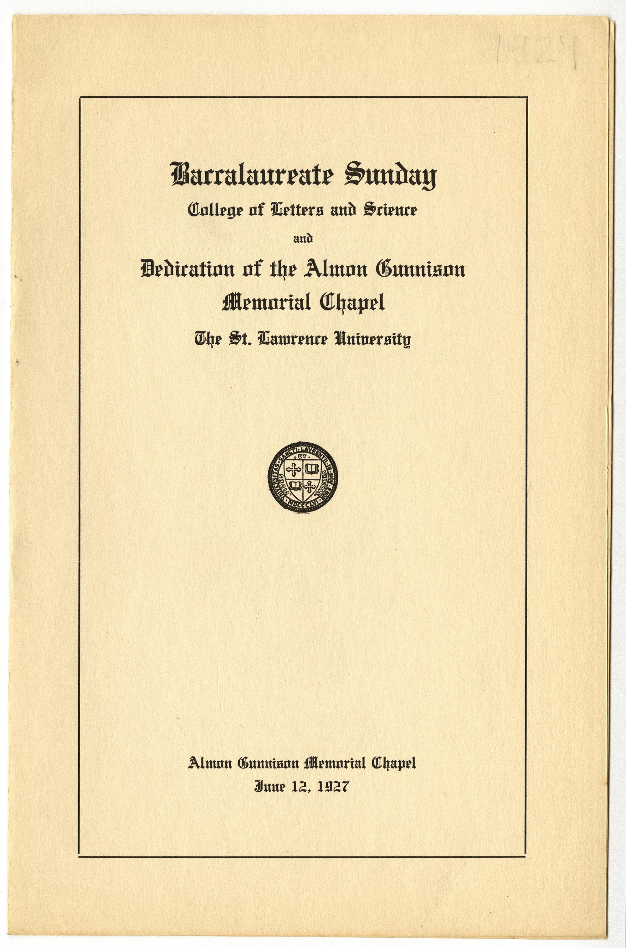 Overview Creator: St. Lawrence University Subject: Church Buildings -- New York (State) -- CantonSt. Lawrence University -- HistoryGunnison Memorial Chapel (Canton, N.Y.) Description:It was over a year later, on June 12 1927 that a formal dedication of Almon Gunnison Memorial Chapel was held. Coverage:Canton, New York Date Original:1927 Decade:Wed, 12/31/1919 - 20:00 Language:eng Rights Rights Management:Original materials may be protected by the Copyright Law of the United States (more information). Resource Identifier:ODY Archives, RG 11, Commencement, Box 2 Technical Digitization Specifications:Scanned at 600ppi on Epson 10000XL scanner as 48-bit RGB uncompressed TIFF images. Images resized to 2000 pixels wide, 72 dpi, and saved as JPEG (level 10) in Photoshop CS6 with Unsharp Mask of 60:1 Date Digital:Tue, 12/10/2013 - 20:00 Format:image/jpeg Type:Image Location Series:2 Box:2 Folder:Commencement 1927
