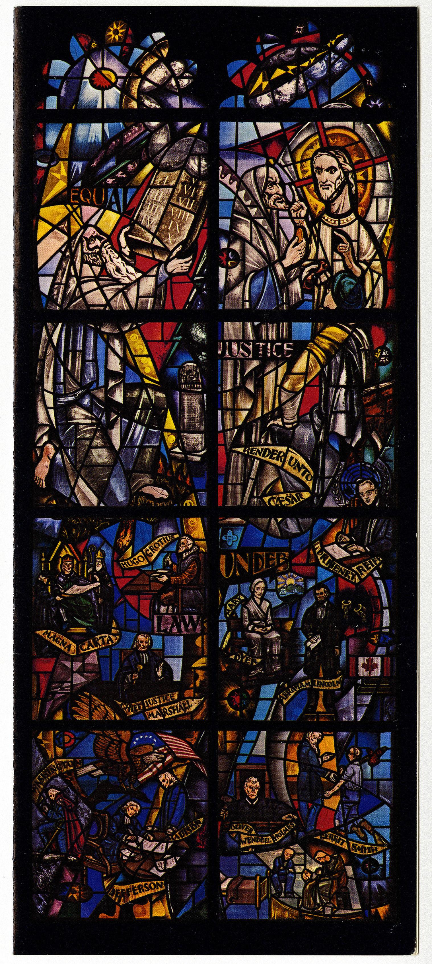 The Law Window, with its iconic statement "Equal Justice Under the Law", was dedicated in May of 1979. It was donated by St. Lawrence trustee Howard Sprow as a memorial to his wife Mildred.