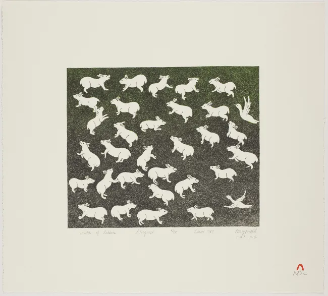 Subject: Inuit artInuit printsrabbitsbirdsanimals in artart -- Canada -- themes, motives Creator: Pudlat, Mary Date Original:1989 Rights Management:Please see the gallery’s statement on copyright and fair use. Detailed Record:http://gallery.stlawu.edu/u?%2Finuit%2C39= Dimensions:18 1/8 x 2 in. (paper) Format-Medium:lithograph