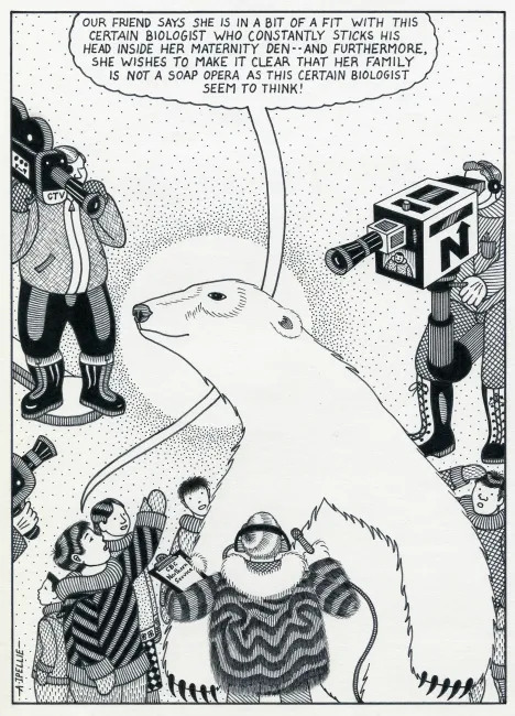 Subject: Inuit artInuit drawingcartoons (commentary)Inuit -- government relationsscientistsbroadcast journalismtelevision camerasCanadian Broadcasting Corporation. Northern Servicepolar bearsanimals in art art -- Canada -- themes, motives Creator: Ipellie, Alootook Date Original:n.d. Rights Management:Please see the gallery’s statement on copyright and fair use. Dimensions:11 x 8 3/8 in. Format-Medium:ink on paper