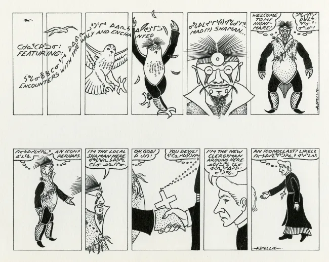 Subject: Inuit artInuit drawingcartoons (commentary)shamansclergyChristianityimperialismowlsanimals in artart -- Canada -- themes, motives Creator: Ipellie, Alootook Date Original:n.d. Rights Management:Please see the gallery’s statement on copyright and fair use. Dimensions:10 x 15 in. Format-Medium:pen and ink on board