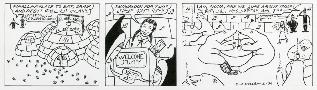 Subject: Inuit artInuit drawingcartoons (commentary)polar bearsiglooscafesanimals in artart -- Canada -- themes, motives Creator: Ipellie, Alootook Date Original:1994 Rights Management:Please see the gallery’s statement on copyright and fair use. Dimensions:10 x 15 in. Format-Medium:pen and ink on board