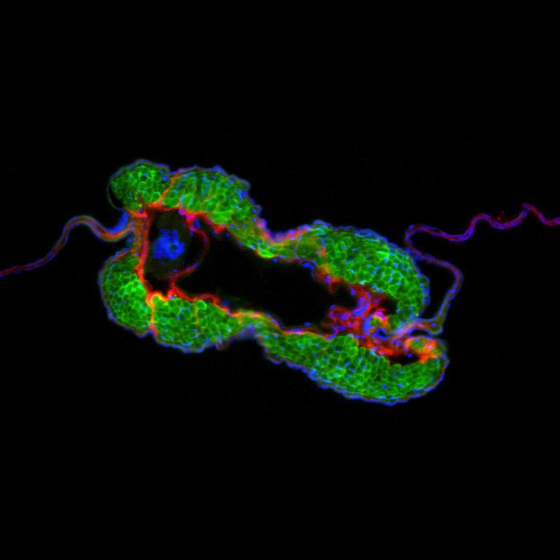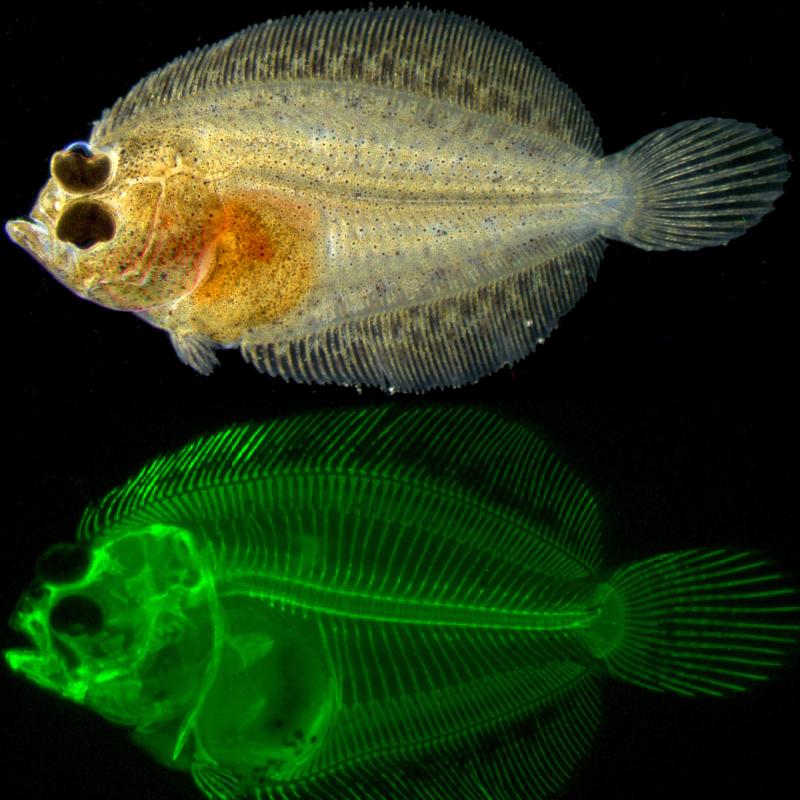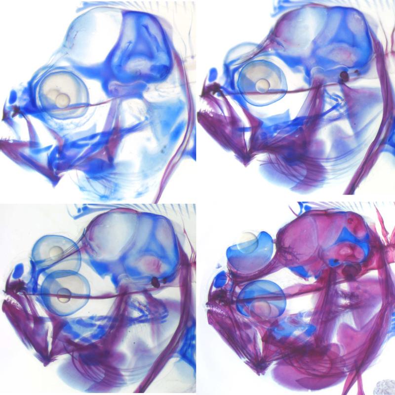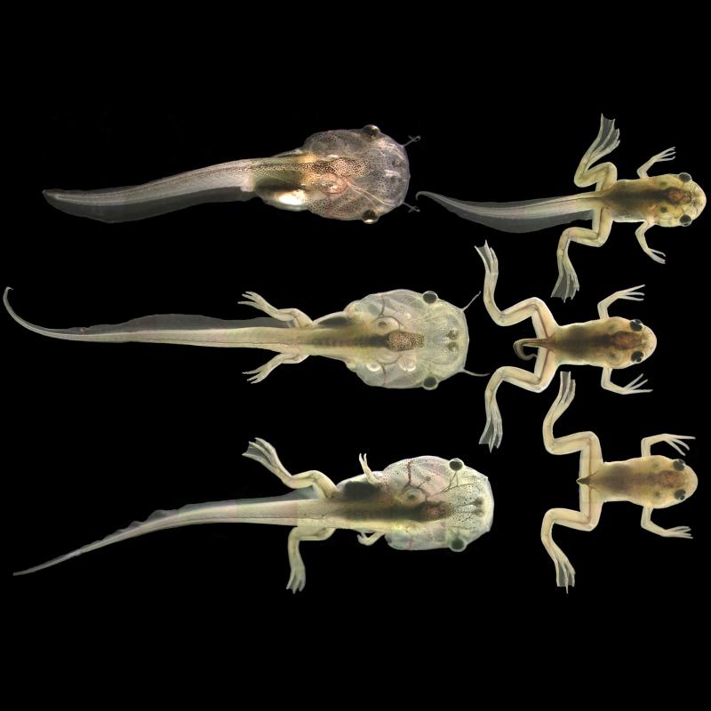 Assistant professor of biology Alex Schreiber, a developmental biologist who is fascinated by vertebrate metamorphosis, uses fluorescence and bright-field and dark-field light microscopy to photograph organisms stained with tissue-specific dyes. With digital imaging software, Schreiber brings still images to life by morphing different developmental stages of larvae into one seamless transformation.