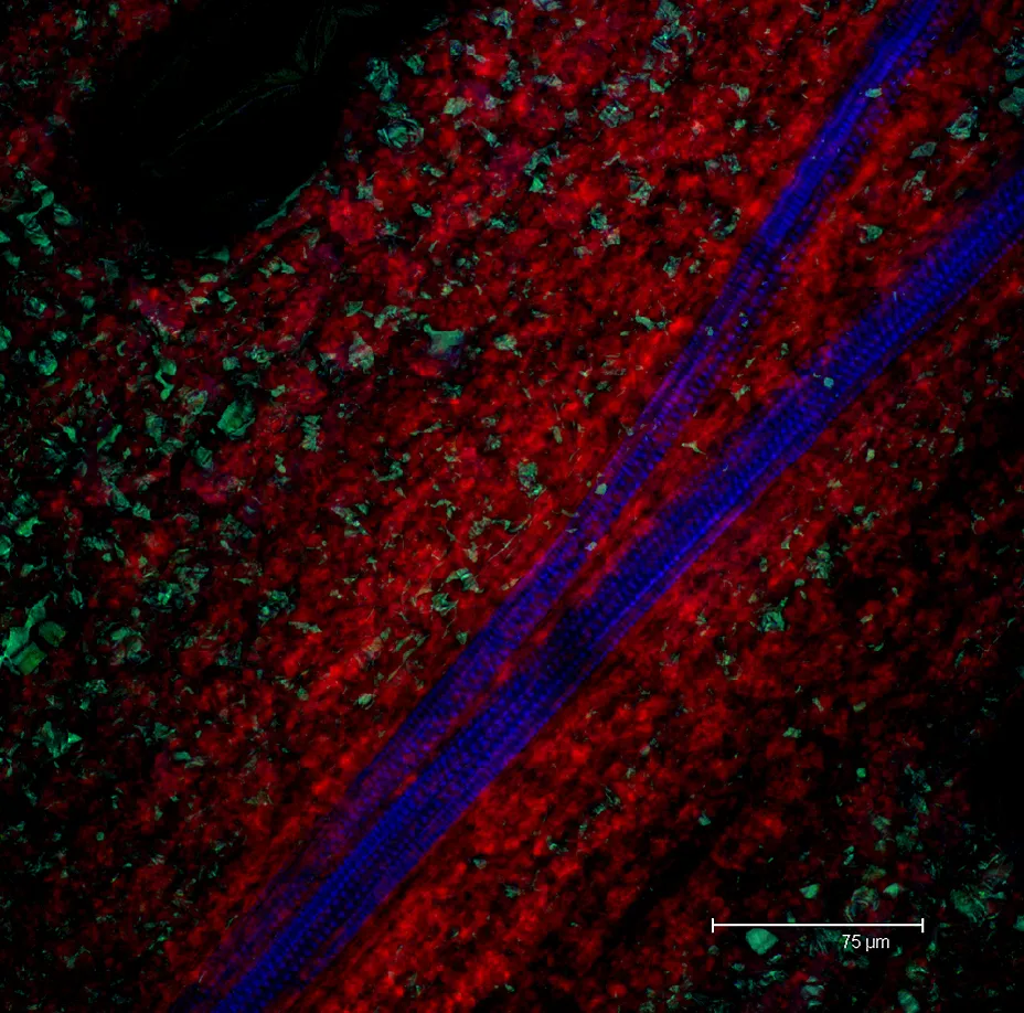 Overview Creator: Clauss, Jenny Subject: Description:Autofluorescent Chrysanthemum Petal (Chrysanthemum indicum); Average projection of a series scan with total depth of section of 27.27 µm; Tannins are shown in green, phloem is shown in blue, and epidermal cells are shown in red Date Original:2013, March 28 Language:eng Rights Rights Management:Original materials may be protected by the Copyright Law of the United States (more information). Technical Digitization Specifications:Saved as JPEG (level 12) in Photoshop CS6 Date Digital:Mon, 02/02/2015 - 20:00 Format:image/jpeg Type:Image