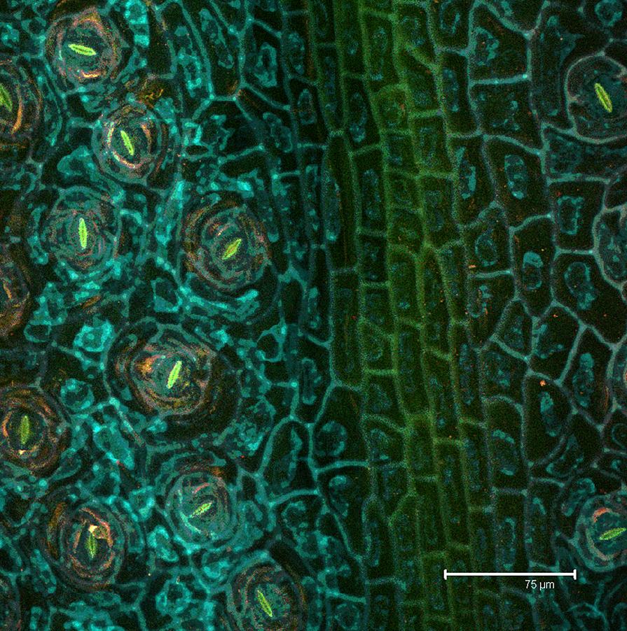 Cell walls are shown in green, waxes are shown in cyan, guard cells are shown in glow