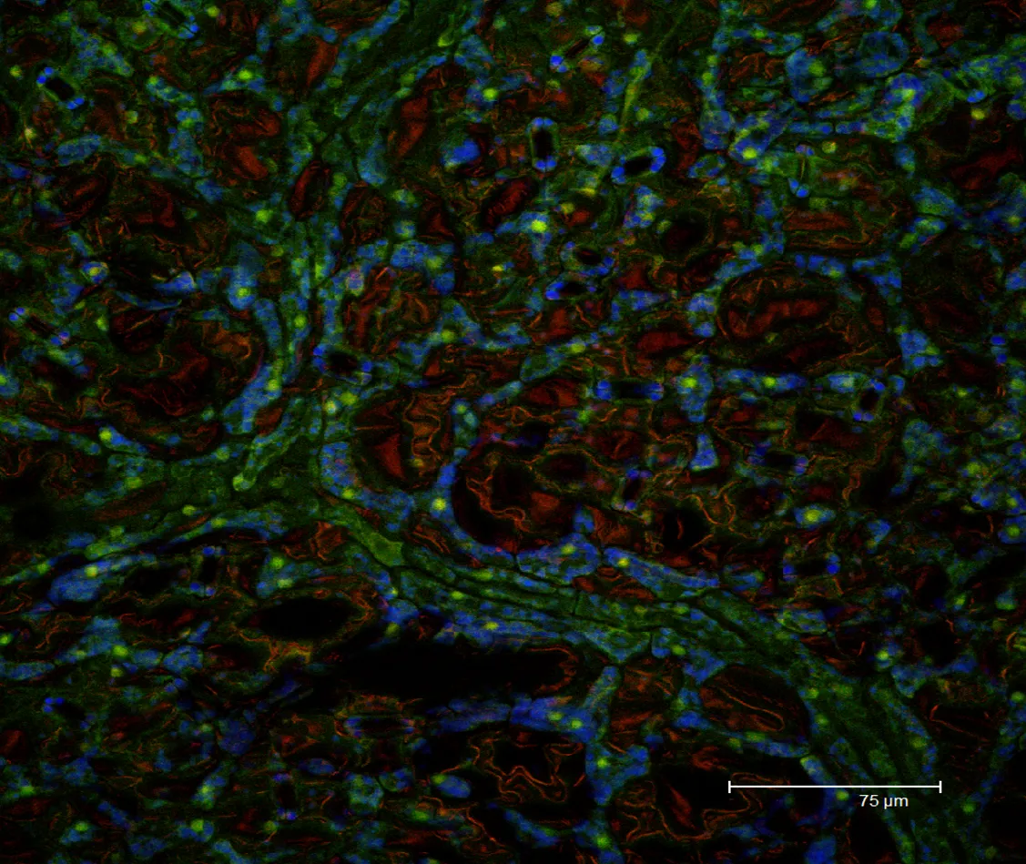 Average projection of series scan of the bottom of an elm tree leaf. Phloem is in green, epithelial cells are in blue.