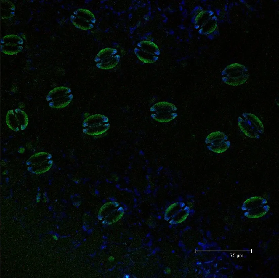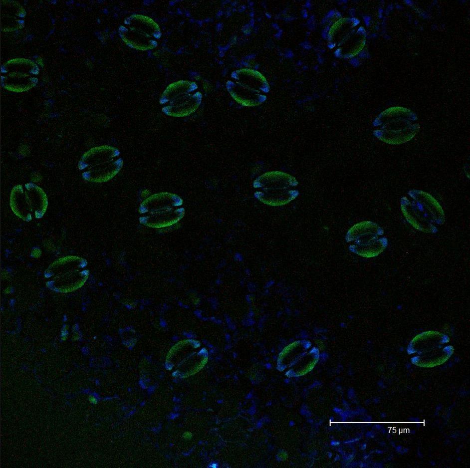 Overview Creator: Schwallie, Ryan Subject: Description:Average projection of the autofluorescence of Paeonia lactiflora, ‘Sarah Bernhardt’ Peony leaf underside. Stomata depicted in green and blue. Date Original:2014, October 15 Language:eng Rights Rights Management:Original materials may be protected by the Copyright Law of the United States (more information). Technical Digitization Specifications:Saved as JPEG (level 12) in Photoshop CS6 Date Digital:Wed, 01/28/2015 - 20:00 Format:image/jpeg Type:Image