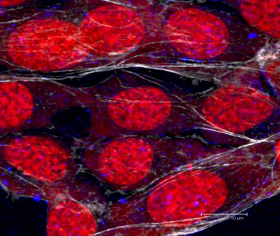 Maximum projection of series scan of B16 cells. F-actin filaments are in grey, nuclei are in red and microtubule associated proteins are in blue.
