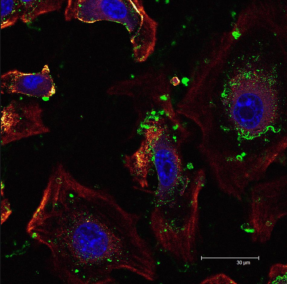 Single scan. Microtubule associated proteins (MAPS) are in green, F actin are in glow, and nuclei are in blue.