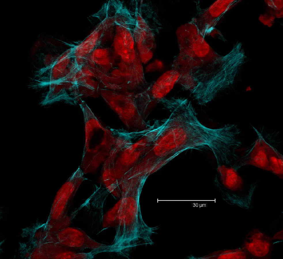 Overview Creator: Langsdale, Hannah Subject: Description:Maximum projection of B16 cells (melanocytes). F-actin filaments shown in cyan. Nuclei shown in red. Depth of section = 4.84 µm. Date Original:2013, April 11 Language:eng Rights Rights Management:Original materials may be protected by the Copyright Law of the United States (more information). Technical Digitization Specifications:Saved as JPEG (level 12) in Photoshop CS6 Date Digital:Tue, 02/03/2015 - 20:00 Format:image/jpeg Type:Image