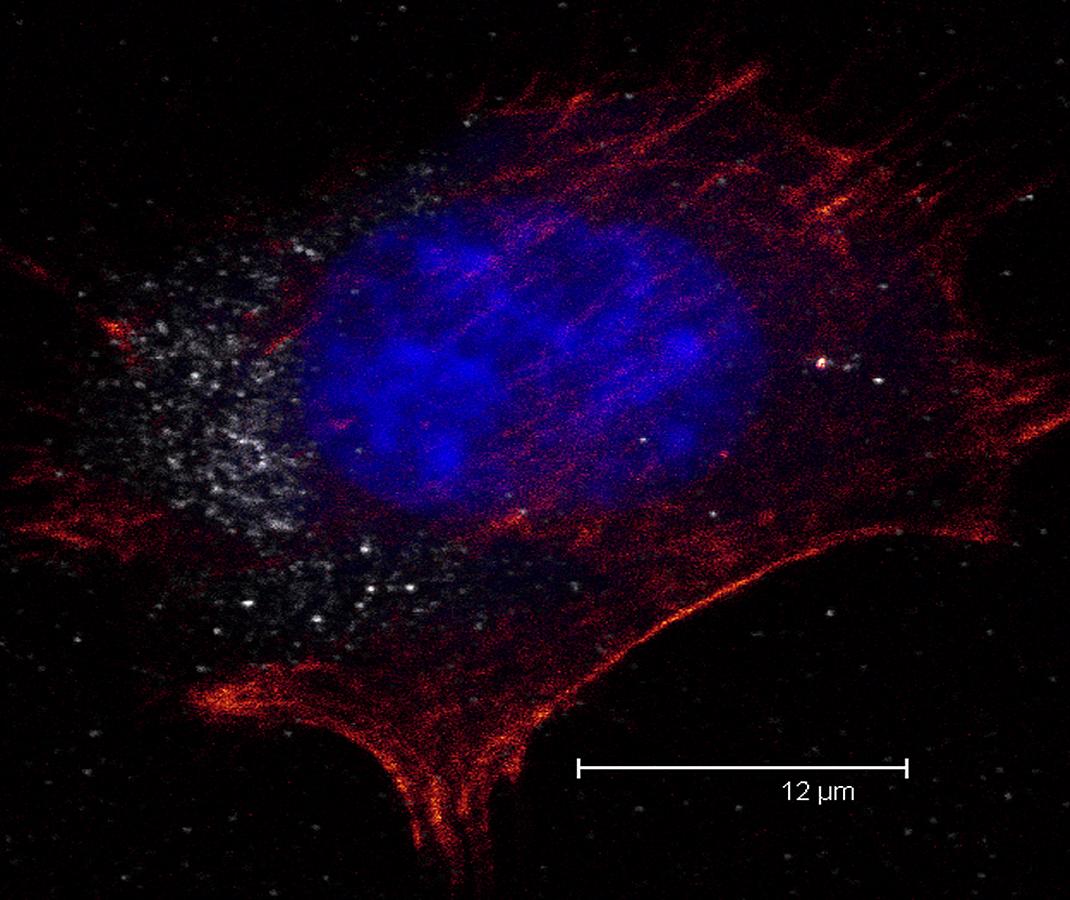Overview Creator: Langsdale, Hannah Subject: Description:Maximum projection of a B16 cell (melanocyte). F-actin filaments shown in glow. Nuclei shown in blue. Intermediate filaments shown in gray. Depth of section = 3.50 µm. Zoom = 2.5 Date Original:2013, April 11 Language:eng Rights Rights Management:Original materials may be protected by the Copyright Law of the United States (more information). Technical Digitization Specifications:Saved as JPEG (level 12) in Photoshop CS6 Date Digital:Tue, 02/03/2015 - 20:00 Format:image/jpeg Type:Image