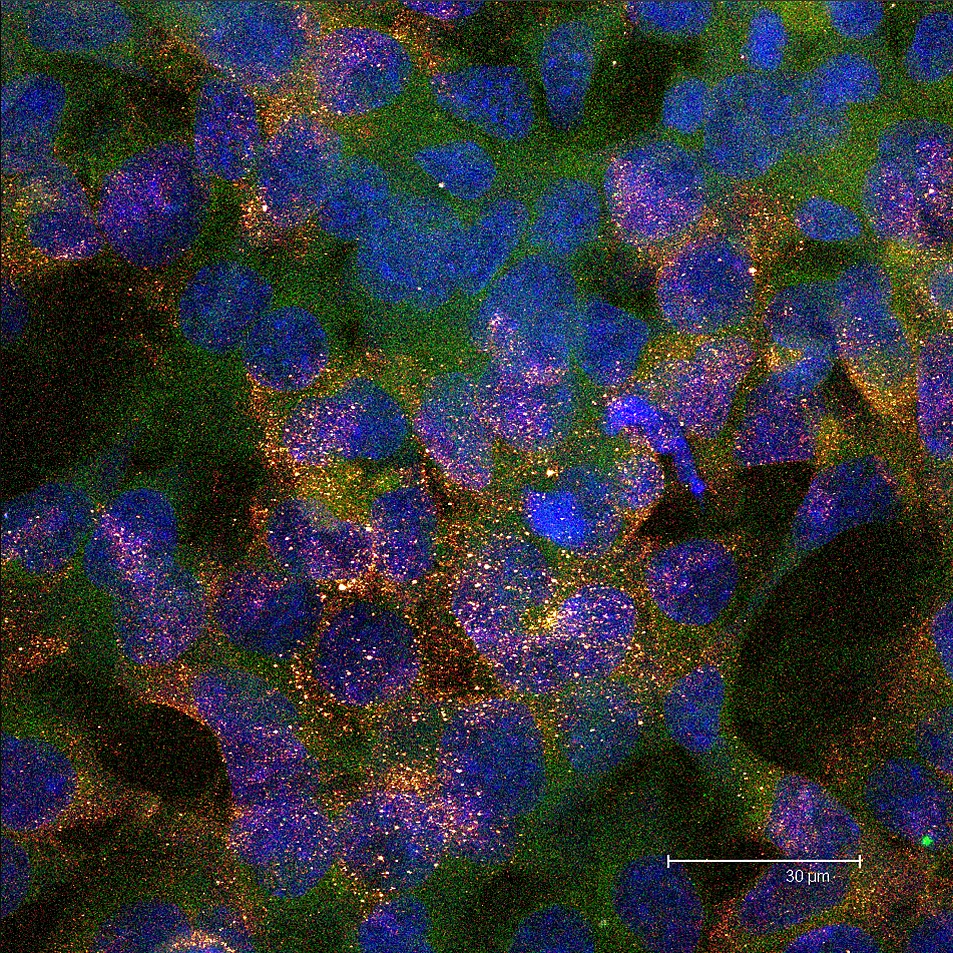 Overview Creator: Nowack, Cam Subject: Description:Max projection of a series scan of B16 cells. Beta III tubulin shown in green, nuclei in blue, mitochondria in glow. Depth of section = 11.60 μm Date Original:2013, April 9 Language:eng Rights Rights Management:Original materials may be protected by the Copyright Law of the United States (more information). Technical Digitization Specifications:Saved as JPEG (level 12) in Photoshop CS6 Date Digital:Wed, 02/04/2015 - 20:00 Format:image/jpeg Type:Image