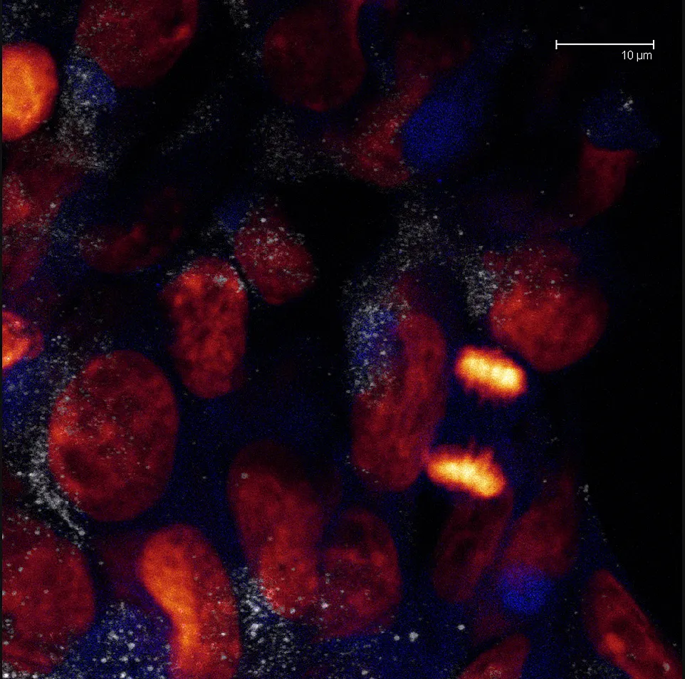 Overview Creator: Nowack, Cam Subject: Description:Average projection of a series scan of B16 cells. Beta III tubulin shown in blue, nuclei in glow, mitochondria in gray. Depth of section = 8.55 μm Date Original:2013, April 9 Language:eng Rights Rights Management:Original materials may be protected by the Copyright Law of the United States (more information). Technical Digitization Specifications:Saved as JPEG (level 12) in Photoshop CS6 Date Digital:Wed, 02/04/2015 - 20:00 Format:image/jpeg Type:Image