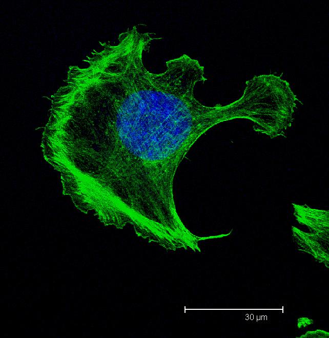 Transparent projection of a series scan of B16 cells. Nuclei shown in blue and F-actin in green. Depth of section = 4.07 μm
