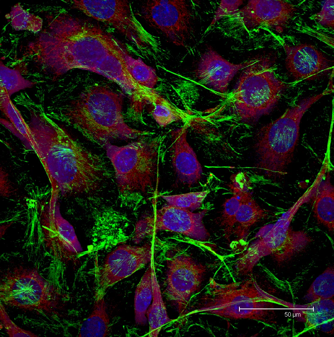 Overview Creator: Pietryka, Megan Subject: Description:B16 Cells Series Scan Depth of section: 7.21μm Maximum Image F-Actin in green Mitochondria in red Nuclei in blue Date Original:2014, October 21 Language:eng Rights Rights Management:Original materials may be protected by the Copyright Law of the United States (more information). Technical Digitization Specifications:Saved as JPEG (level 12) in Photoshop CS6 Date Digital:Tue, 01/27/2015 - 20:00 Format:image/jpeg Type:Image