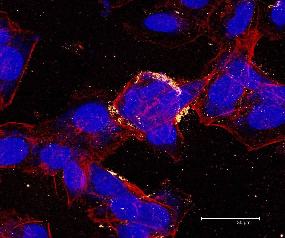 Overview Creator: Rescott, Marissa Subject: Description:Max image of series scanned 9.16 µm section of B16 melanoma cells. Nuclei shown in blue, F-actin shown in red, Microtubule proteins shown in glow Date Original:2013, April 9 Language:eng Rights Rights Management:Original materials may be protected by the Copyright Law of the United States (more information). Technical Digitization Specifications:Saved as JPEG (level 12) in Photoshop CS6 Date Digital:Thu, 02/05/2015 - 20:00 Format:image/jpeg Type:Image