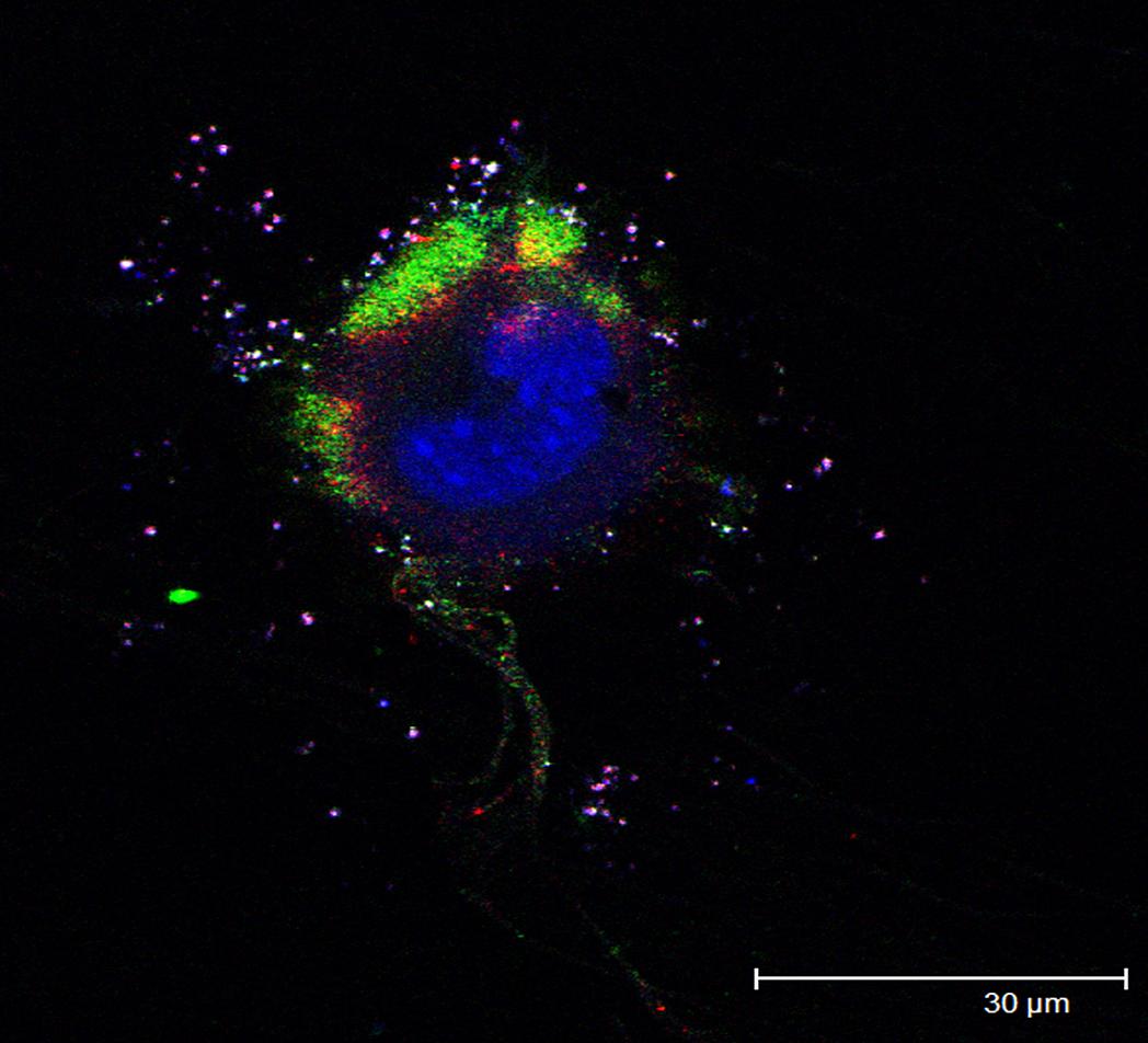 Overview Creator: Rescott, Marissa Subject: Description:Single scan image of B16 (melanoma) cells. Nuclei shown in blue, intermediate filaments in red, microtubules in green Date Original:2013, April 12 Language:eng Rights Rights Management:Original materials may be protected by the Copyright Law of the United States (more information). Technical Digitization Specifications:Saved as JPEG (level 12) in Photoshop CS6 Date Digital:Thu, 02/05/2015 - 20:00 Format:image/jpeg Type:Image