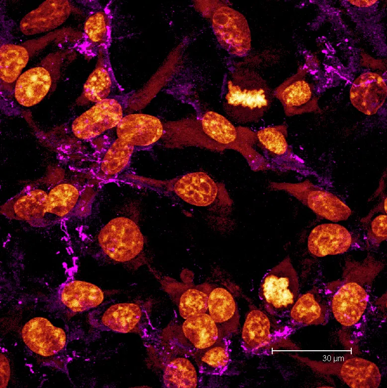 Overview Creator: Pietryka, Megan Subject: Description:B16 Cells Series Scan Depth of section: 6.84 μm Maximum Image Nuclei in glow Microtubule associated proteins in magenta Date Original:2014, November 5 Language:eng Rights Rights Management:Original materials may be protected by the Copyright Law of the United States (more information). Technical Digitization Specifications:Saved as JPEG (level 12) in Photoshop CS6 Date Digital:Tue, 01/27/2015 - 20:00 Format:image/jpeg Type:Image