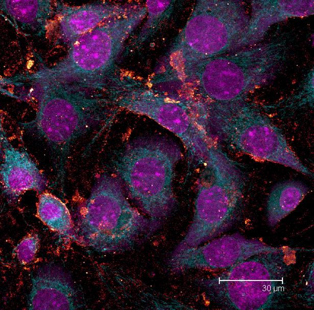 Overview Creator: Pietryka, Megan Subject: Description:B16 Cells Series scan Depth of section: 3.13 μm Maximum Image Mitochondria in cyan Nuclei in magenta Microtubule associated proteins in glow Date Original:2014, November 14 Language:eng Rights Rights Management:Original materials may be protected by the Copyright Law of the United States (more information). Technical Digitization Specifications:Saved as JPEG (level 12) in Photoshop CS6 Date Digital:Tue, 01/27/2015 - 20:00 Format:image/jpeg Type:Image