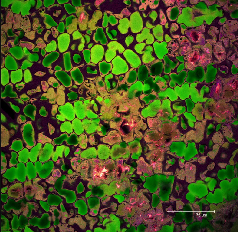Overview Creator: LeValley, Kristy Subject: Description:Single scan auto-fluorescent image of Ballerina Blue Fuchsia petal. Epidermis in magenta, cuticle in green, essential oils in glow Date Original:2013, April 2 Language:eng Rights Rights Management:Original materials may be protected by the Copyright Law of the United States (more information). Technical Digitization Specifications:Saved as JPEG (level 12) in Photoshop CS6 Date Digital:Wed, 02/04/2015 - 20:00 Format:image/jpeg Type:Image