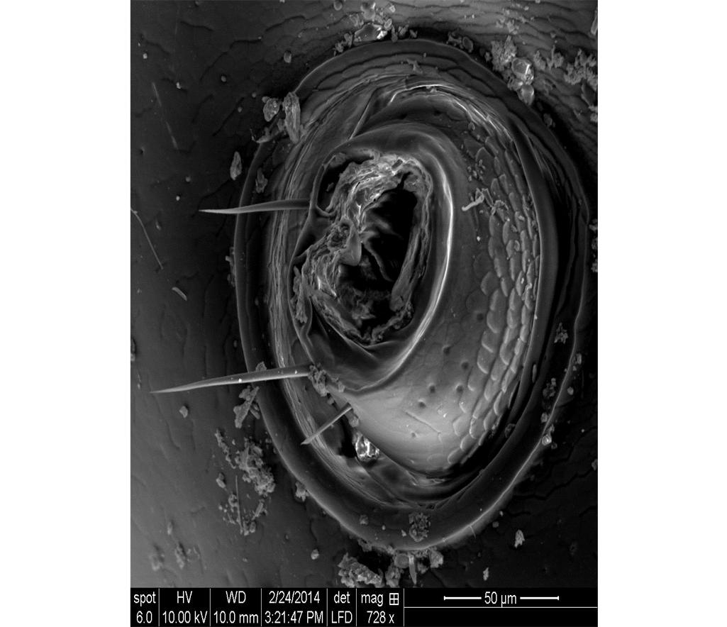 Overview Creator: Brase, Janpeter Subject: Description:Bartholemu the Centipede's eye, Spot: 6, HV: 10.0, KV: 10.00, WD: 10.0, Mag: 728x, Det: LFD Date Original:2014, February 24 Language:eng Rights Rights Management:Original materials may be protected by the Copyright Law of the United States (more information). Technical Digitization Specifications:Saved as JPEG (level 12) in Photoshop CS6 Date Digital:Mon, 01/19/2015 - 20:00 Format:image/jpeg Type:Image