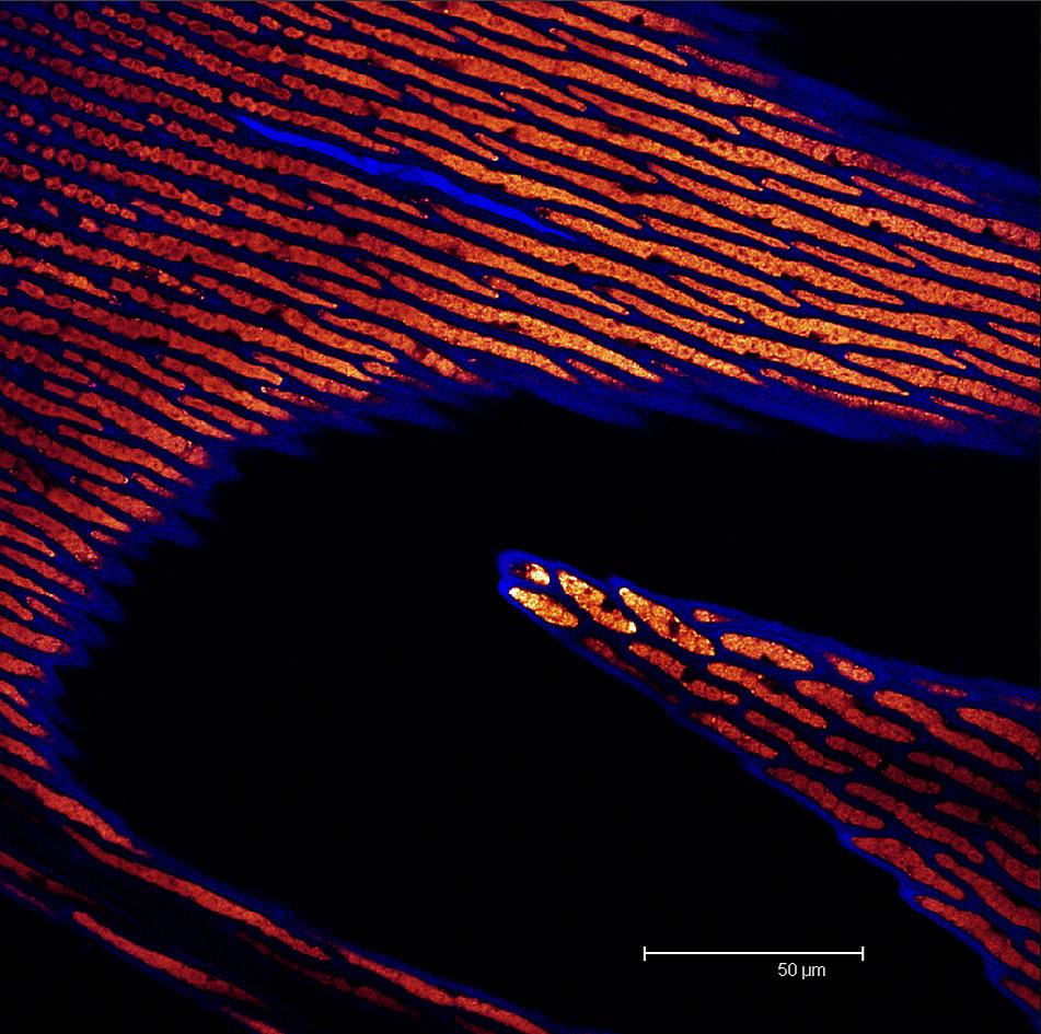 Overview Creator: Nowack, Cam Subject: Description:Single scan image of common moss(dicranum montanum). Cell walls shown in blue and chlorophyll in glow Date Original:2013, April 16 Language:eng Rights Rights Management:Original materials may be protected by the Copyright Law of the United States (more information). Technical Digitization Specifications:Saved as JPEG (level 12) in Photoshop CS6 Date Digital:Wed, 02/04/2015 - 20:00 Format:image/jpeg Type:Image