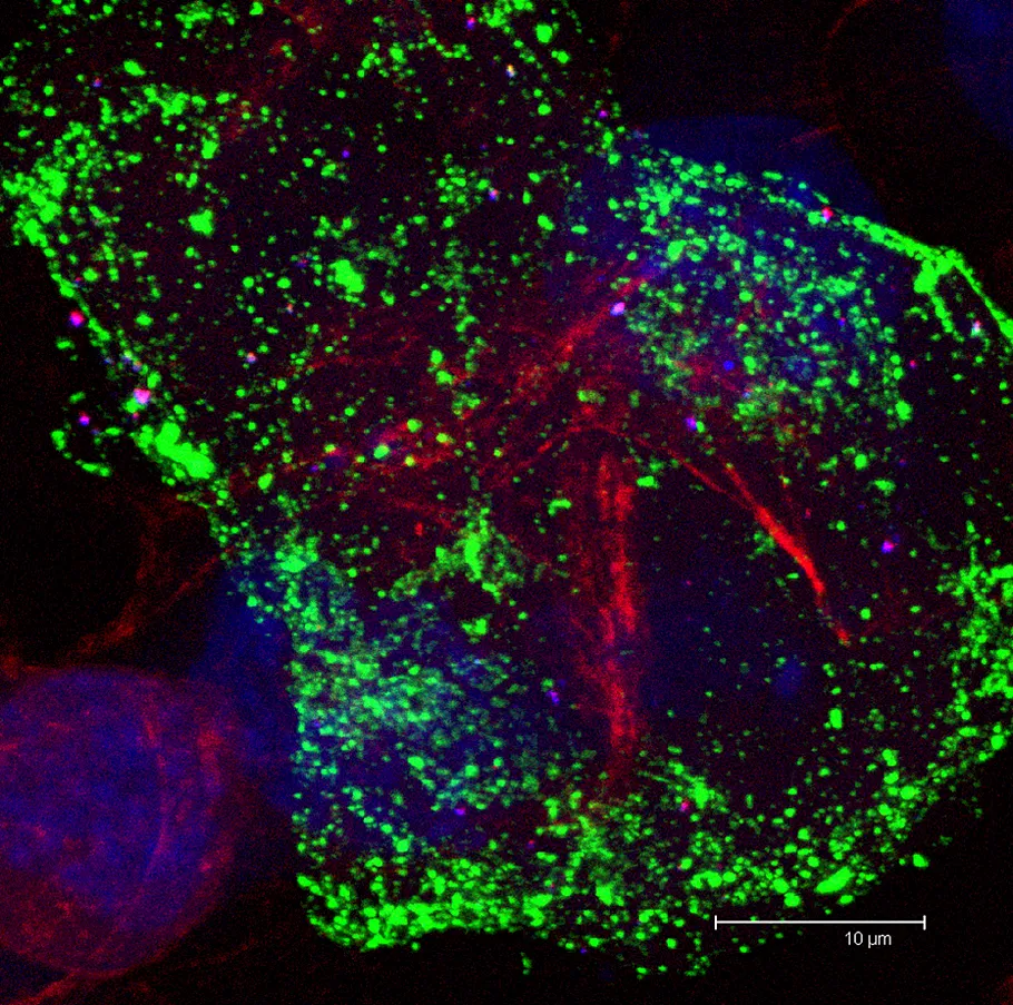 Overview Creator: Tousignant, Joey Subject: Description:Coverslip of B16 Cells; Transparent Image of Series Scan; 9.69μm Depth of Section; Zoom of 3.00; F-Actin in Red; Nuclei in Blue; Microtubules in Green Date Original:2013, April 25 Language:eng Rights Rights Management:Original materials may be protected by the Copyright Law of the United States (more information). Technical Digitization Specifications:Saved as JPEG (level 12) in Photoshop CS6 Date Digital:Sun, 02/08/2015 - 20:00 Format:image/jpeg Type:Image