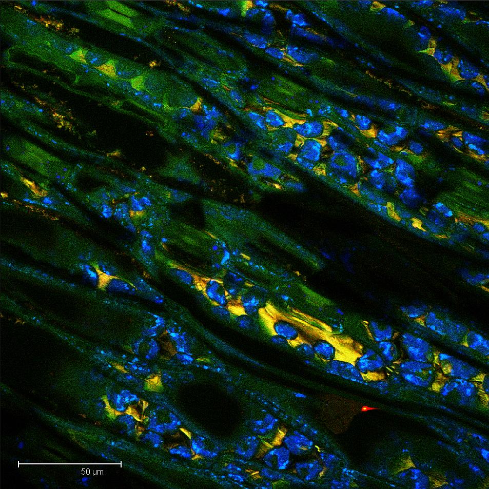 Overview Creator: Nowack, Cam Subject: Description:Single scan of the surface from a widthwise section of Crab Grass (Digitaria ciliaris). Cell walls shown in green, Sugar and water solutions in vacuoles shown in blue Date Original:2013, March 24 Language:eng Rights Rights Management:Original materials may be protected by the Copyright Law of the United States (more information). Technical Digitization Specifications:Saved as JPEG (level 12) in Photoshop CS6 Date Digital:Wed, 02/04/2015 - 20:00 Format:image/jpeg Type:Image