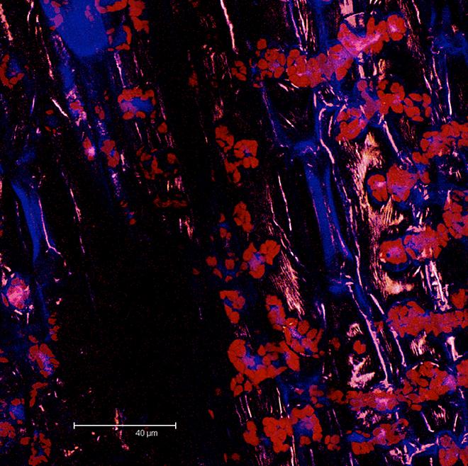 Overview Creator: Weis, Connor Subject: Description:Transparent projection Of a series scan of a Crab grass leaf (Digitaria). Sugars shown in glow, chloroplasts in red, cellular wall shown in blue. 87.92 µm section Date Original:2013, April 12 Language:eng Rights Rights Management:Original materials may be protected by the Copyright Law of the United States (more information). Technical Digitization Specifications:Saved as JPEG (level 12) in Photoshop CS6 Date Digital:Sun, 02/08/2015 - 20:00 Format:image/jpeg Type:Image