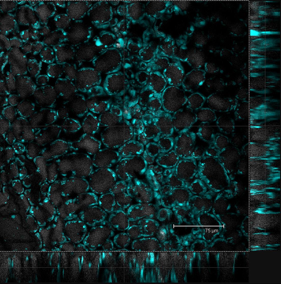 Overview Creator: Morra, Adriana Subject: Description:Cross section of a series scan image of a Ginkgo biloba “Ginkgo” leaf. Epidermal cells are shown in gray and cell walls are displayed in cyan. Depth of Section: 41.22 µm Date Original:2014, November 18 Language:eng Rights Rights Management:Original materials may be protected by the Copyright Law of the United States (more information). Technical Digitization Specifications:Saved as JPEG (level 12) in Photoshop CS6 Date Digital:Tue, 01/27/2015 - 20:00 Format:image/jpeg Type:Image