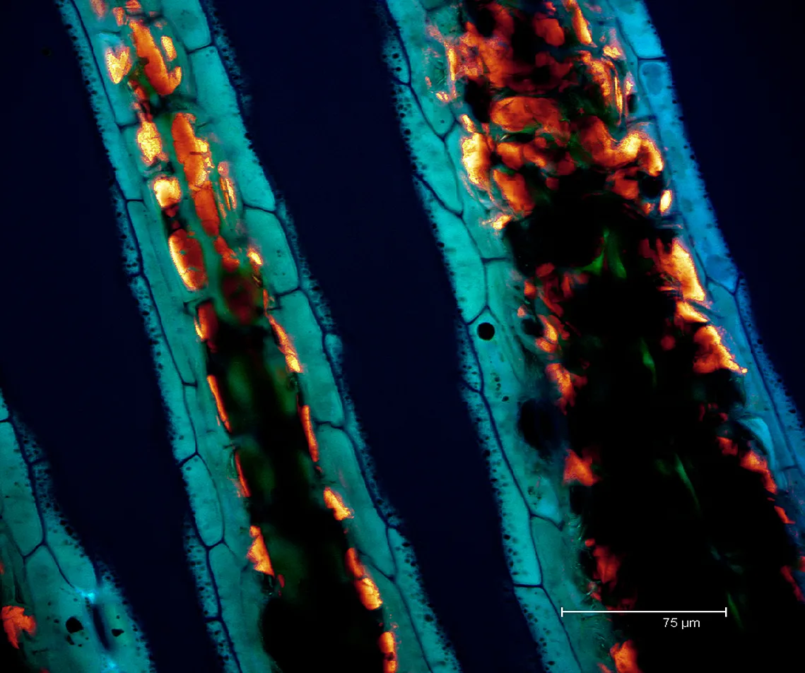 Overview Creator: Rescott, Marissa Subject: Description:Average image from series scanned 27.71 μm section from autofluorescent Dracaena warneckii (lemon- lime) leaf. Mesophyll cells in glow, epidermal cells in blue, unidentified structure in green Date Original:2013, March 28 Language:eng Rights Rights Management:Original materials may be protected by the Copyright Law of the United States (more information). Technical Digitization Specifications:Saved as JPEG (level 12) in Photoshop CS6 Date Digital:Thu, 02/05/2015 - 20:00 Format:image/jpeg Type:Image