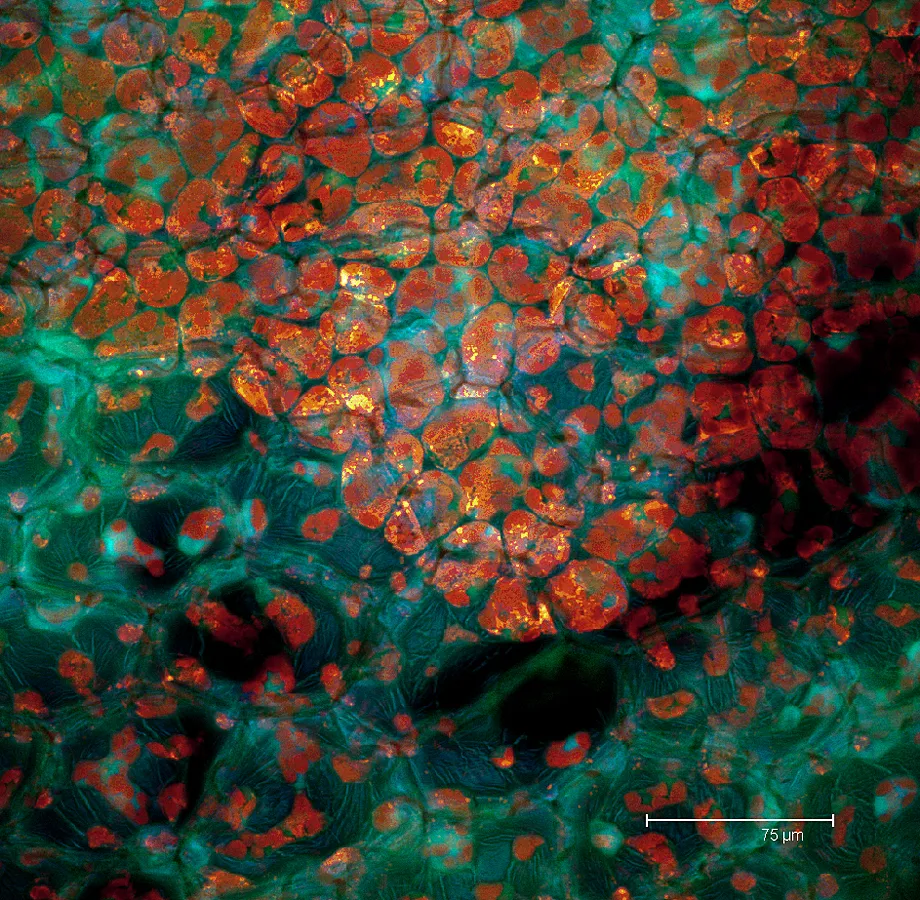 Overview Creator: Langsdale, Hannah Subject: Description:Average projection of a Dumb Cane plant leaf (Dieffenbachia). Cytoplasm shown in green and blue. Water and sugar solution shown in glow. Total depth of section = 10.58 µm. Date Original:2013, April 10 Language:eng Rights Rights Management:Original materials may be protected by the Copyright Law of the United States (more information). Technical Digitization Specifications:Saved as JPEG (level 12) in Photoshop CS6 Date Digital:Tue, 02/03/2015 - 20:00 Format:image/jpeg Type:Image